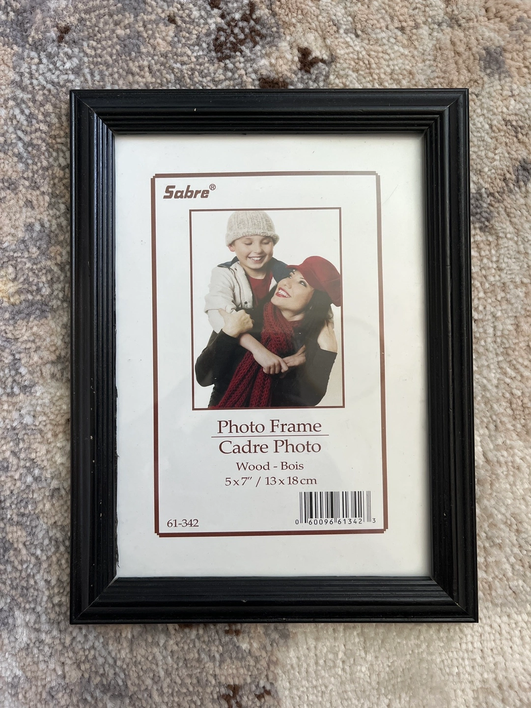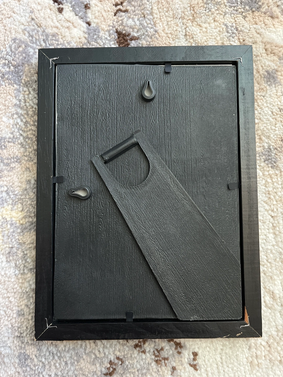 542Black wooden picture frame for a 5x7" photo. It has a stand on the back and two hangers for hanging.