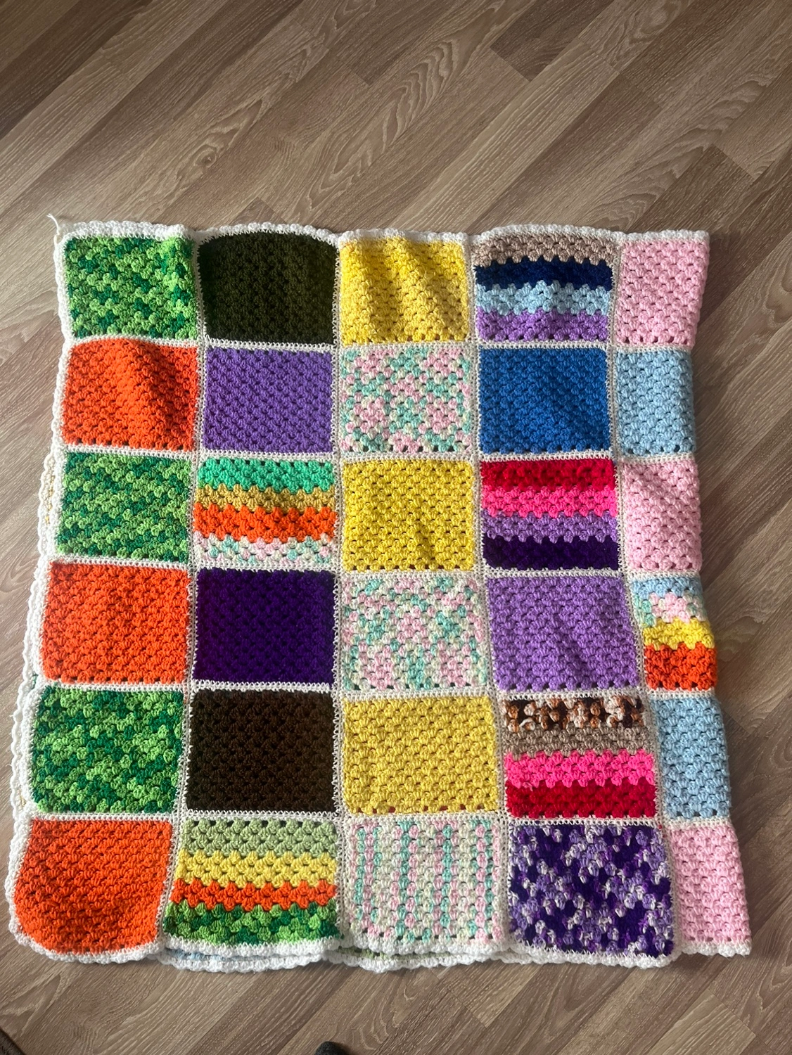 A colourful, crocheted blanket made from squares in various colours. The blanket is bordered in white.