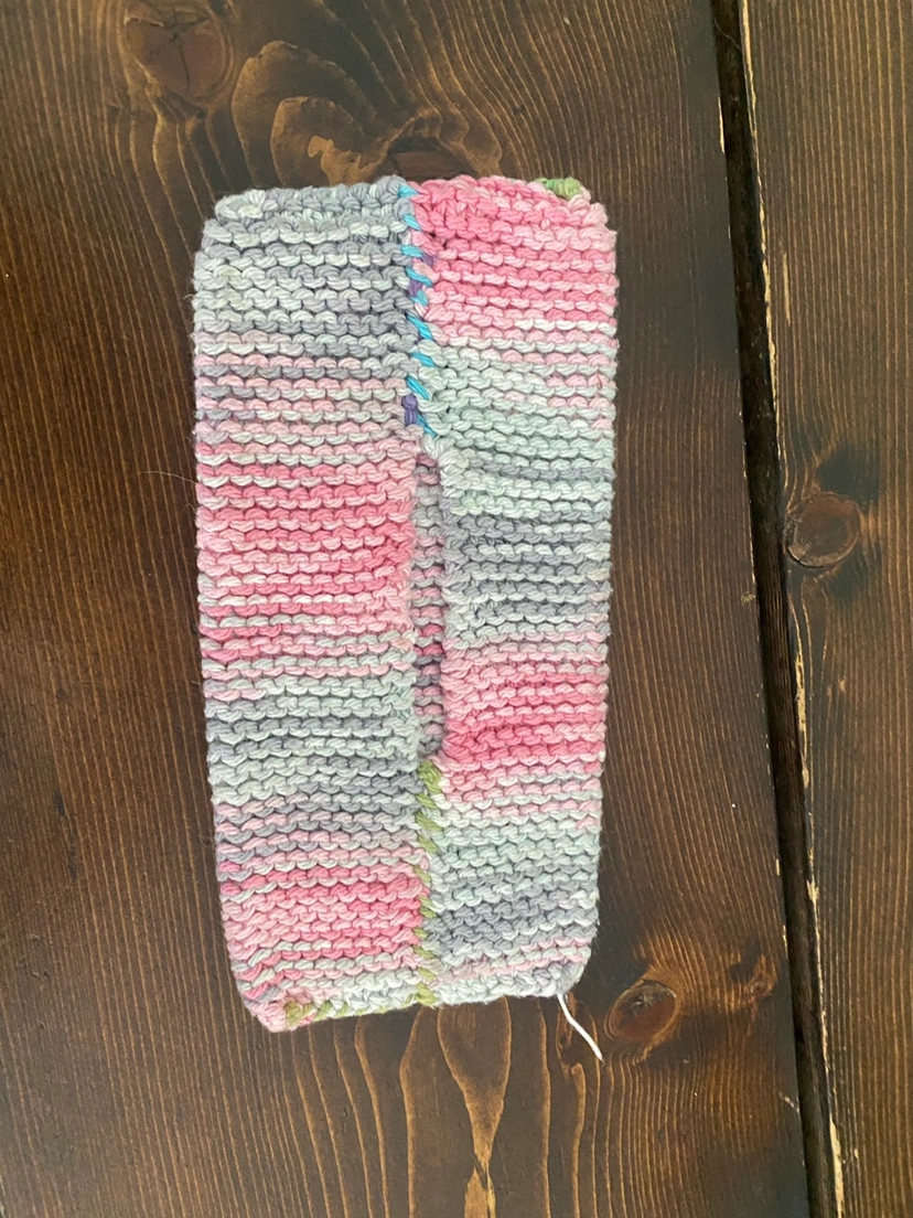 A hand-knitted dishcloth in a multi-coloured yarn. The dishcloth is approximately 7 inches by 10 inches. It has a hole at one end for hanging. It is machine washable and dryer safe. Please note that this is a handmade item, so there may be some slight imperfections.