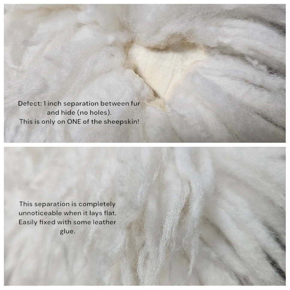 Only one of the sheepskin has a 1” separation between the fur and the skin (that can easily be fixed with glue) and is completely unnoticeable. Please see photo. Price for just this ONE sheepskin reflects its current condition.