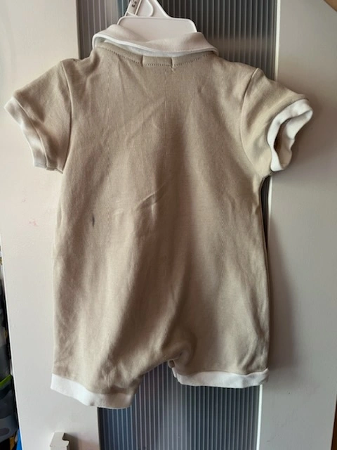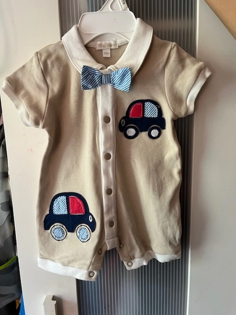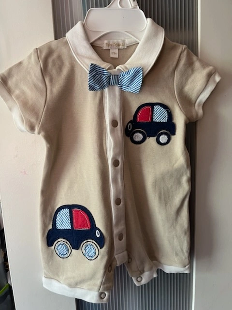 This is a beige onesie with blue and red car appliques and a blue and white striped bow tie. It is a short sleeve onesie with a button closure.