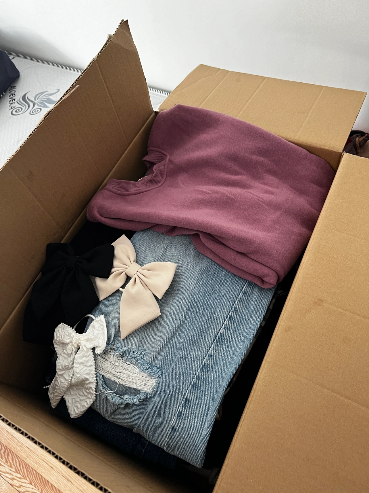 747A box of women's clothing, including a mauve sweater, blue jeans, pajamas, shirts, and others. Im doing some declutterring of my closet. I will mostly giving my clothes for free Mostly worn 2-3x Well taken care off! Ready for pick up Message if interested FIRST COME FIRST SERVE