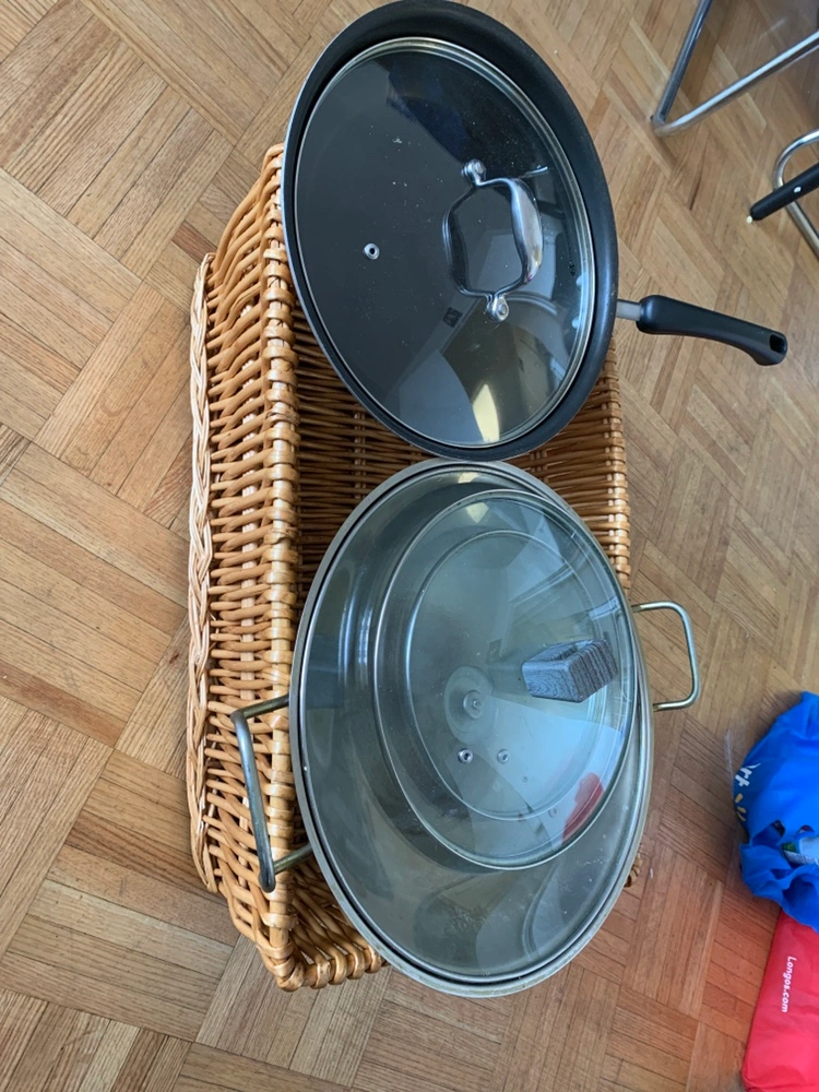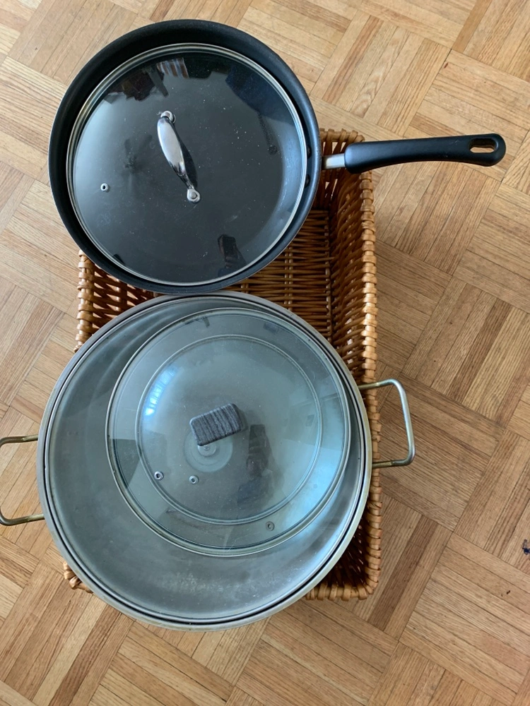 Set includes a frying pan and a pot with their corresponding lids. The pot features metal handles and the pan features a black plastic handle. Both lids are made of glass.
