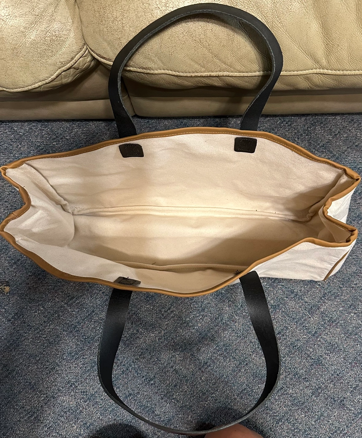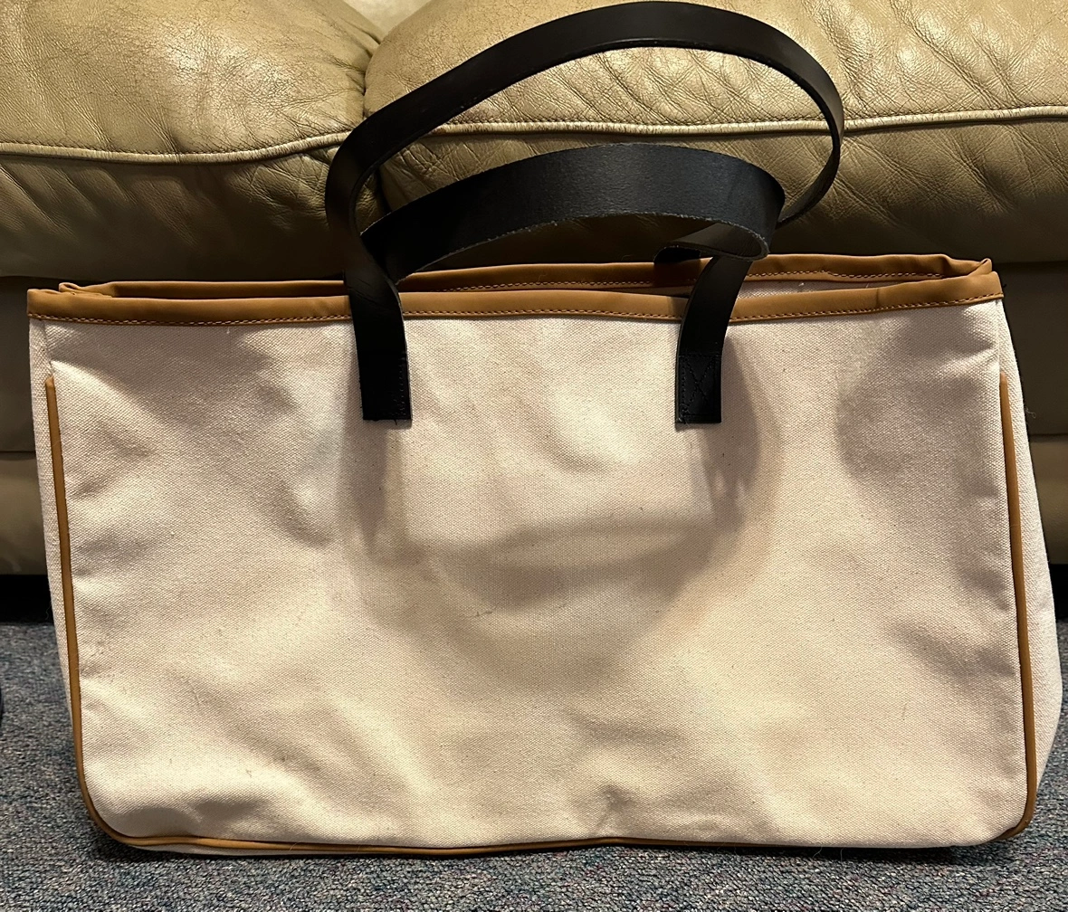 Large canvas tote bag with black leather handles and tan trim. The bag has "ROAD TRIP" printed on the front in black by Jillian Harris.