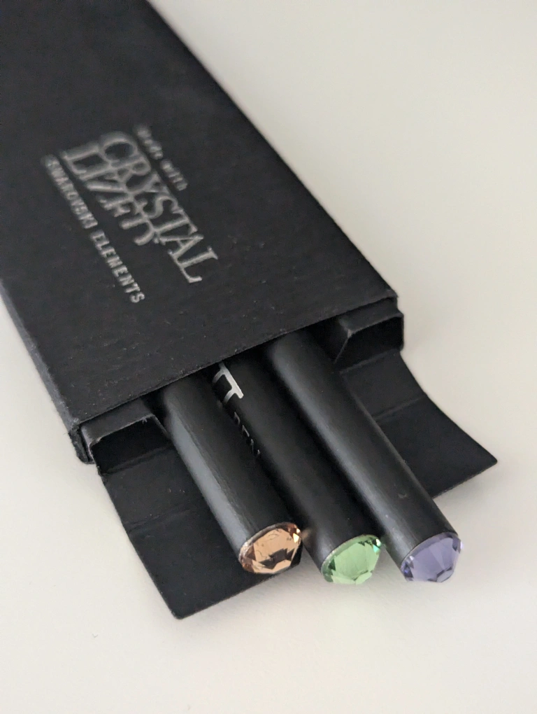 Set of 3 pencils with crystal embellishments. Made with Swarovski elements. In original box.
