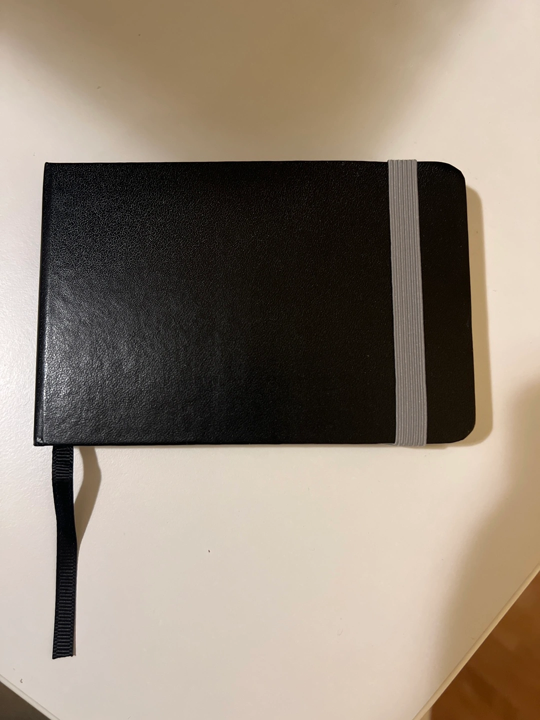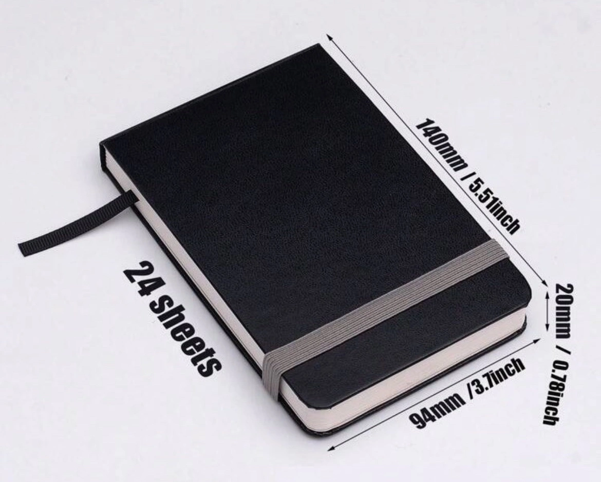 NEW Black sketchbook with 24 sheets of 300gsm paper (thick paper). One side of the paper is medium grain and the other side is fine grain. Perforated for easy tearing. Ribbon bookmark, and pocket on the back. Elastic to hold things together.