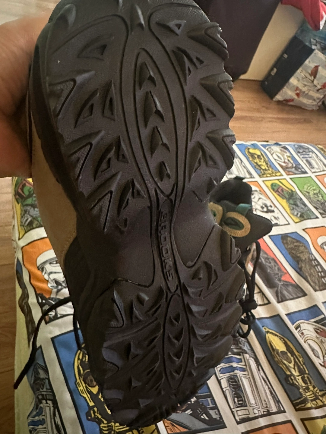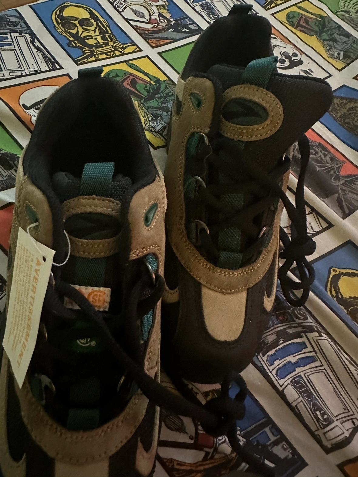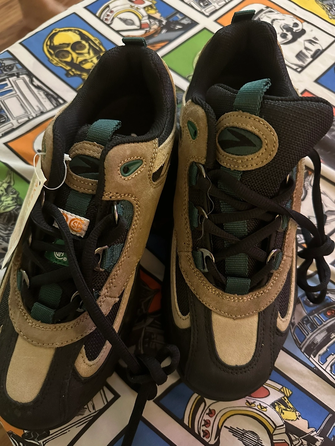 157These are a pair of Skools shoes that have never been worn. They are black, green, and brown in colour, and have a suede upper.