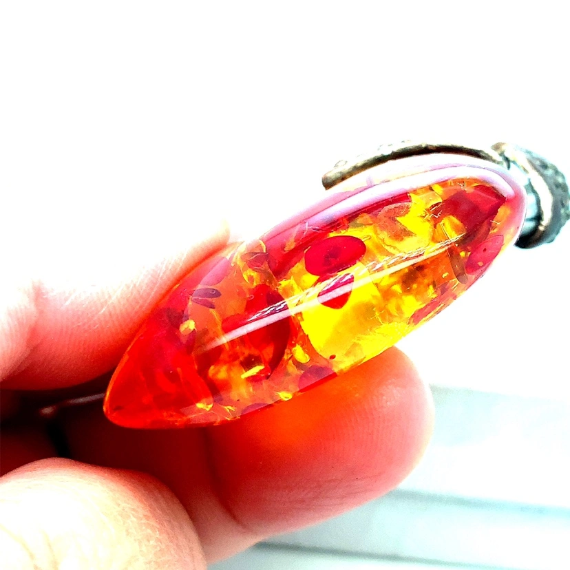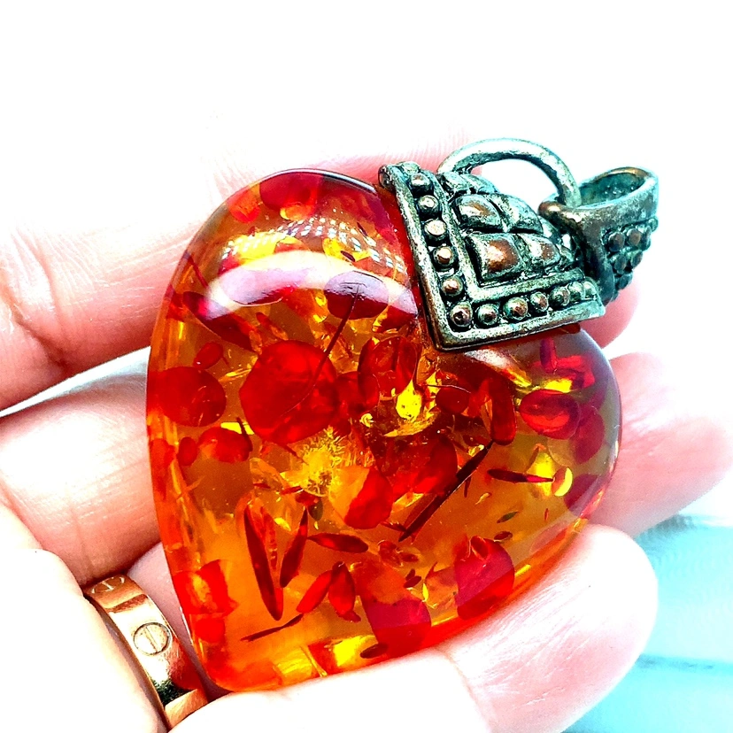 This pendant is heart shaped and features a large piece of amber with red and yellow tones. It is surrounded by a silver tone setting.