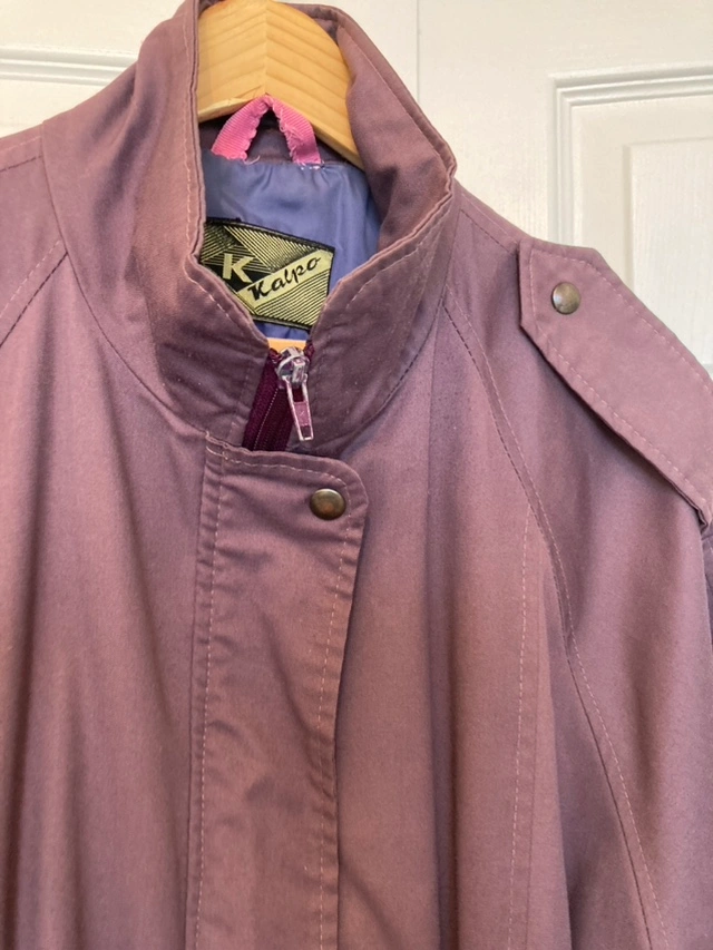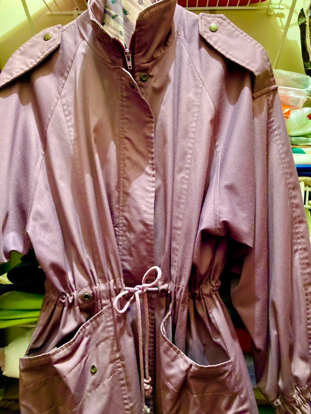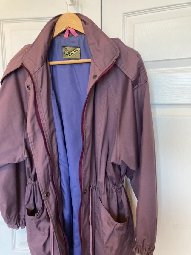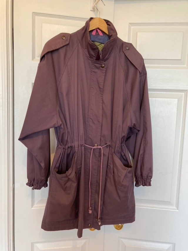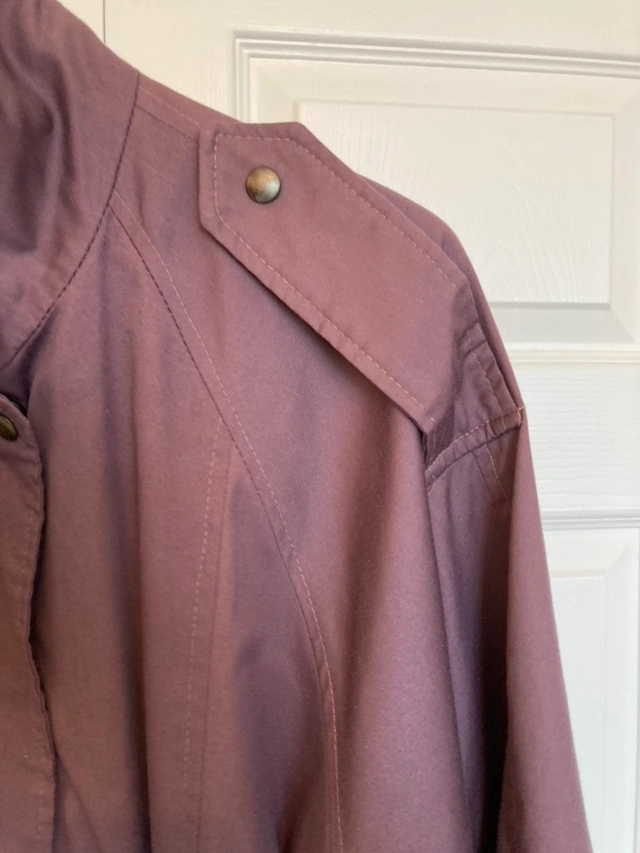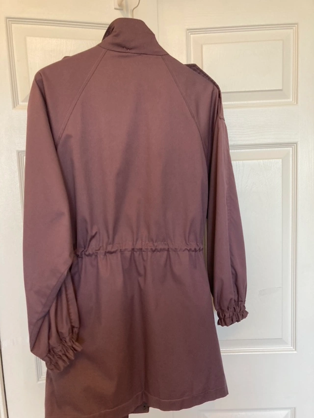 114Purple /raspberry colour fall jacket with oversized pockets, and a drawstring waist. Sorry color doesn’t show well on pictures.