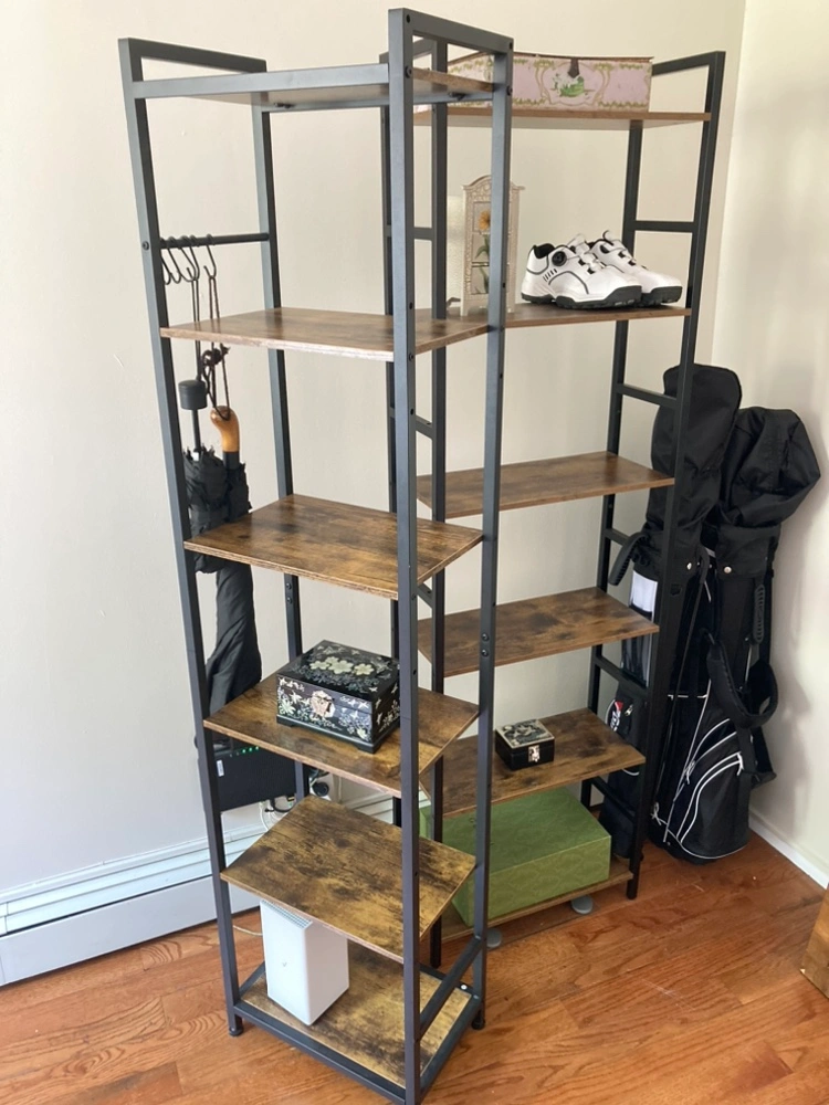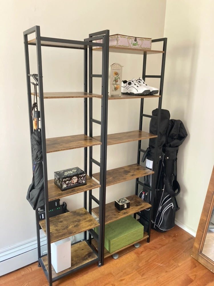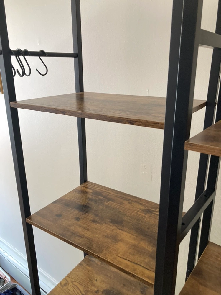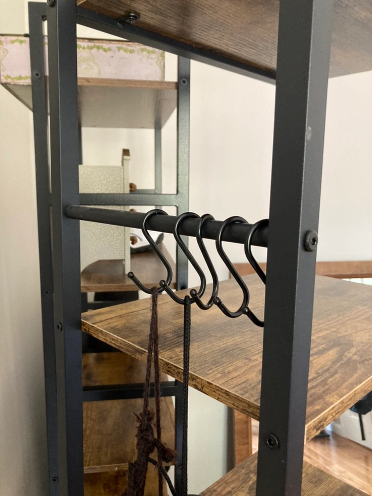 Black metal bookshelf with five wooden shelves and a hanging bar.