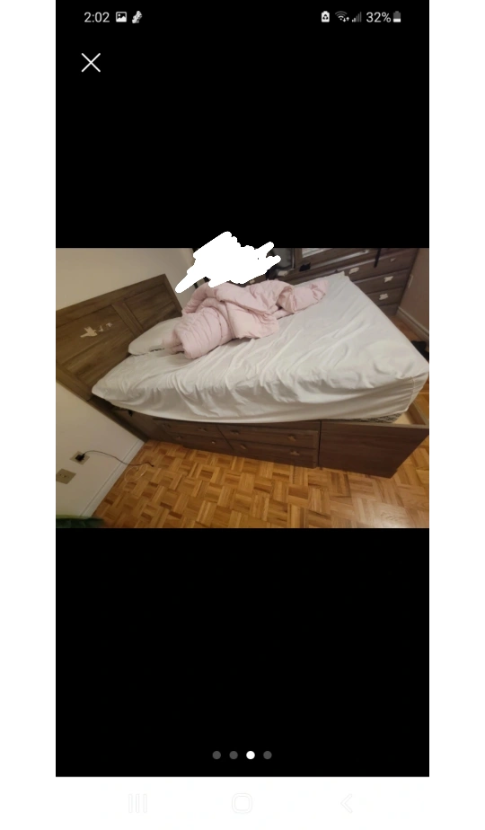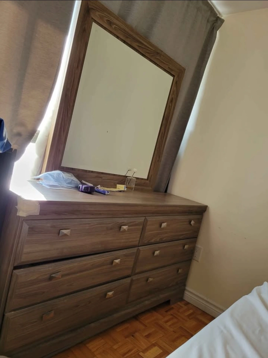 It includes a bed frame with 12 storage drawers, a 6 drawer dresser with mirror