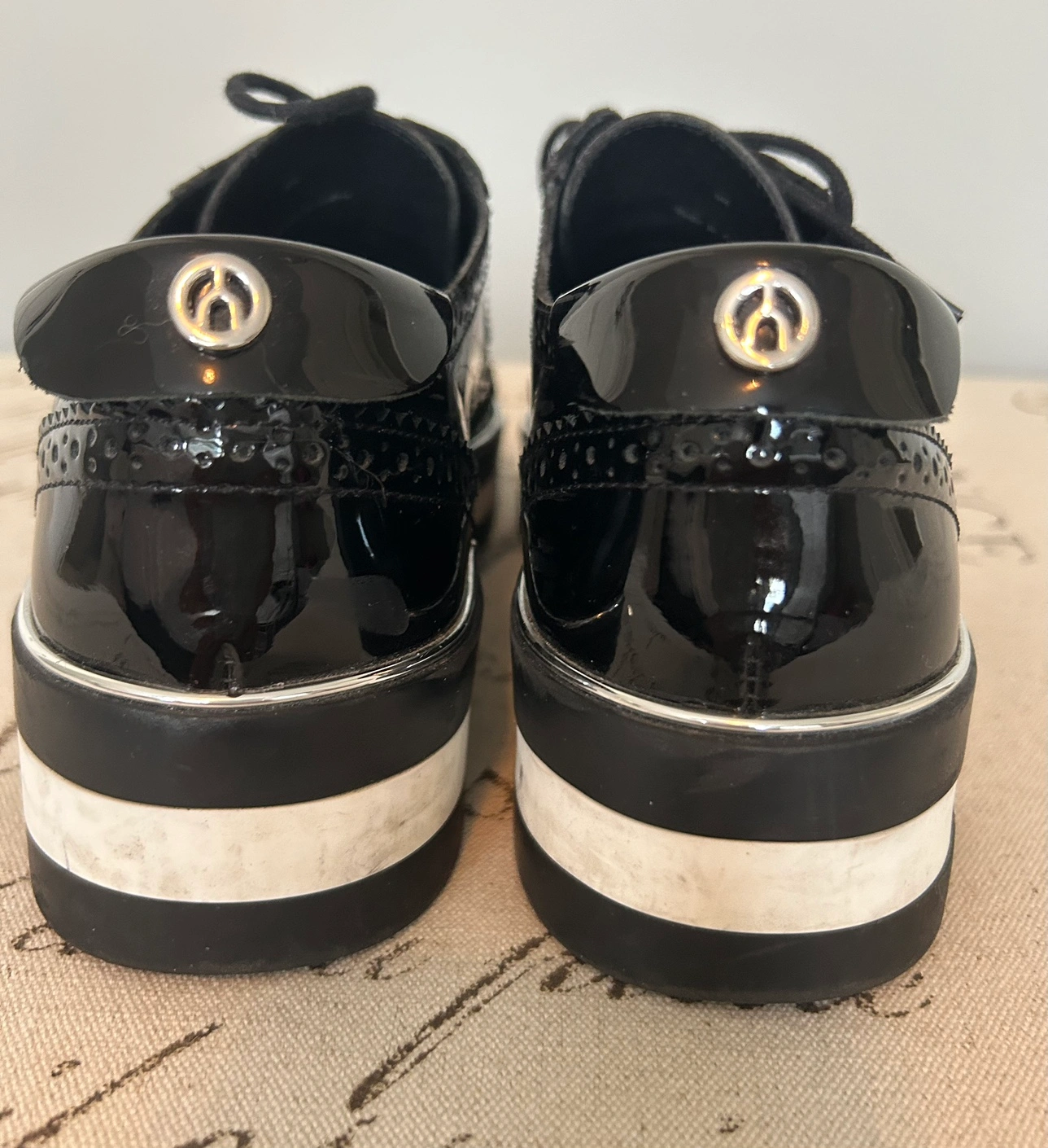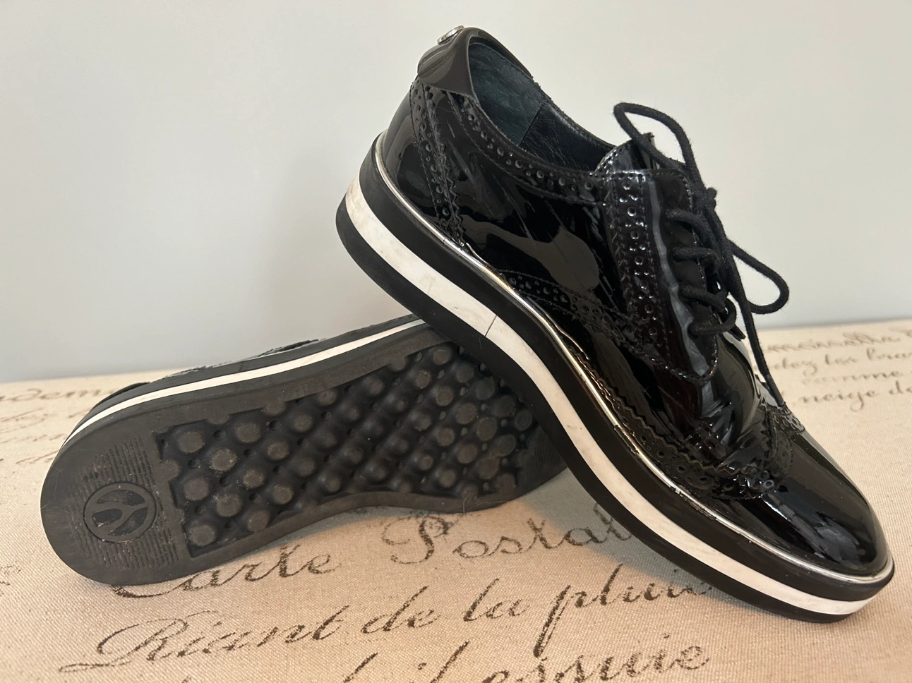Black patent leather oxford shoes with a white platform sole. They have lace up closure and a brogue design.