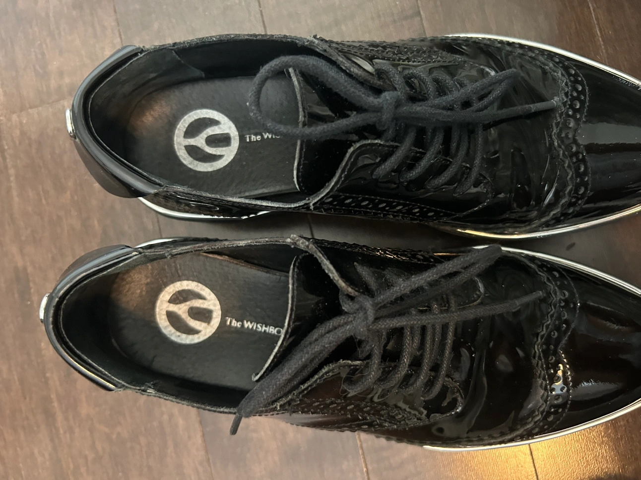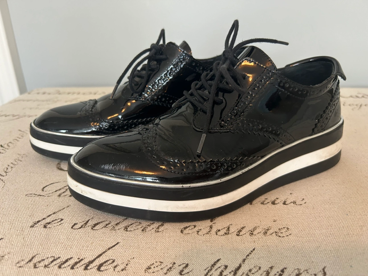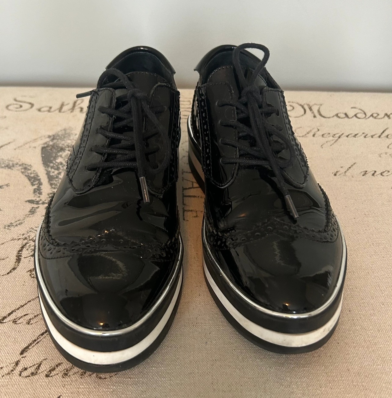 Black patent leather oxford shoes with a white platform sole. They have lace up closure and a brogue design.