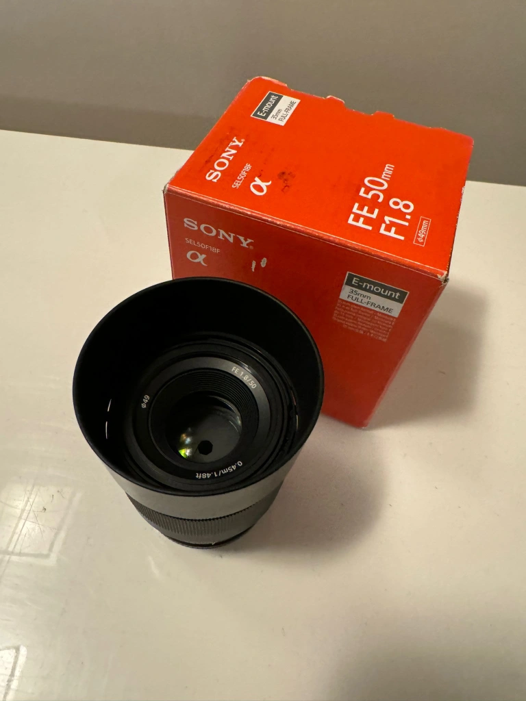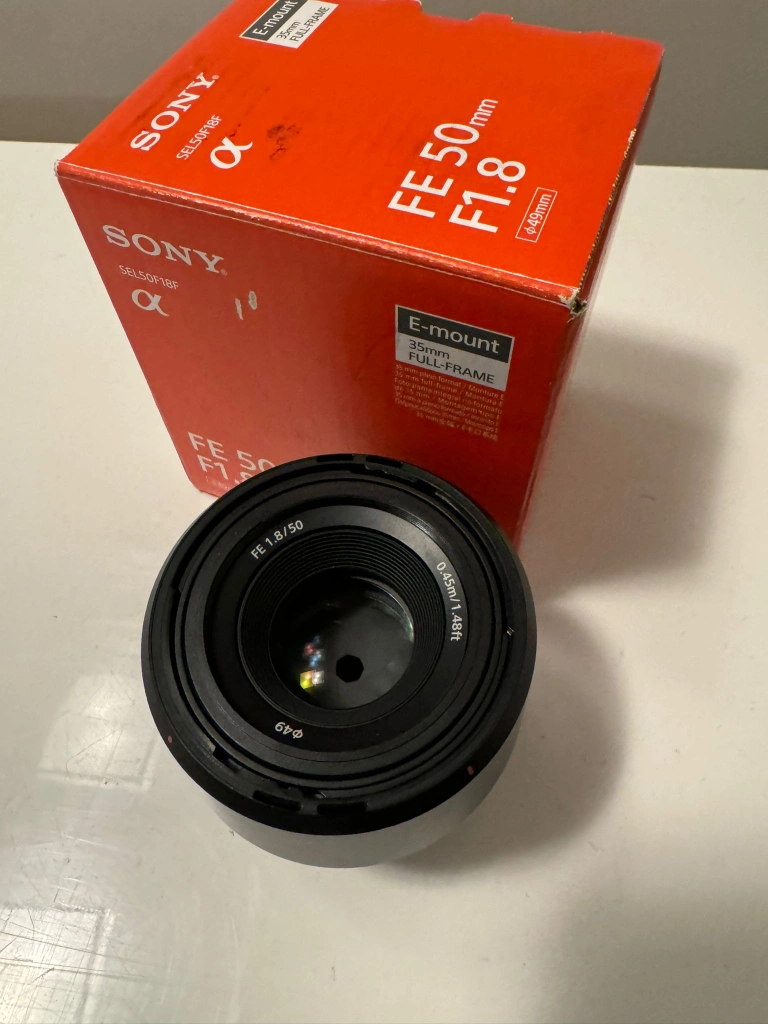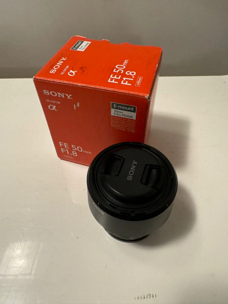 This is a Sony 50mm lens that is in good condition. The lens comes with the original box and lens cap. It is an E-mount lens, meaning it will work with any Sony camera that has an E-mount. This lens is in excellent condition and has been used very little. It has been kept in a climate-controlled environment.