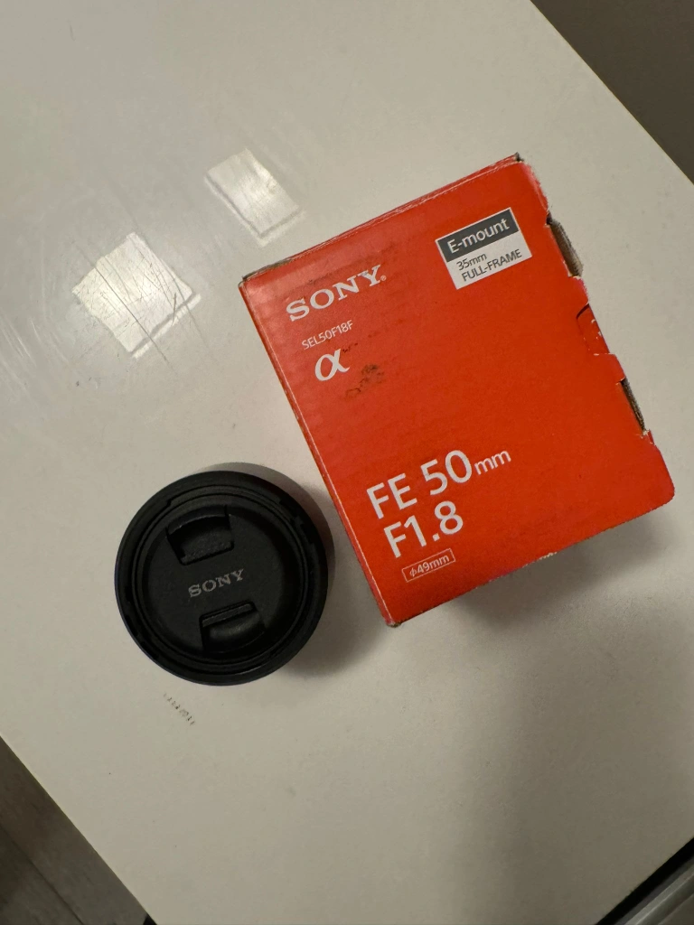 This is a Sony 50mm lens that is in good condition. The lens comes with the original box and lens cap. It is an E-mount lens, meaning it will work with any Sony camera that has an E-mount. This lens is in excellent condition and has been used very little. It has been kept in a climate-controlled environment.