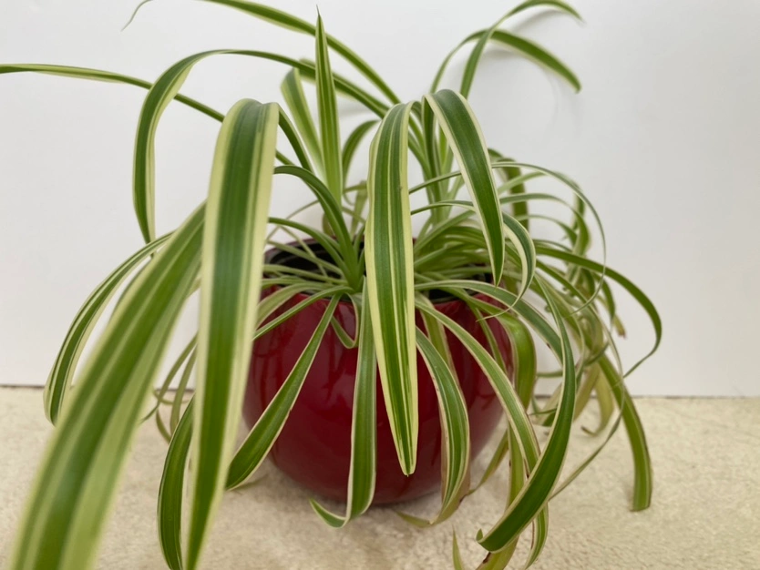 This is a spider plant in a red ceramic pot. The plant has long green and white striped leaves. The pot is a shiny, bright red colour.