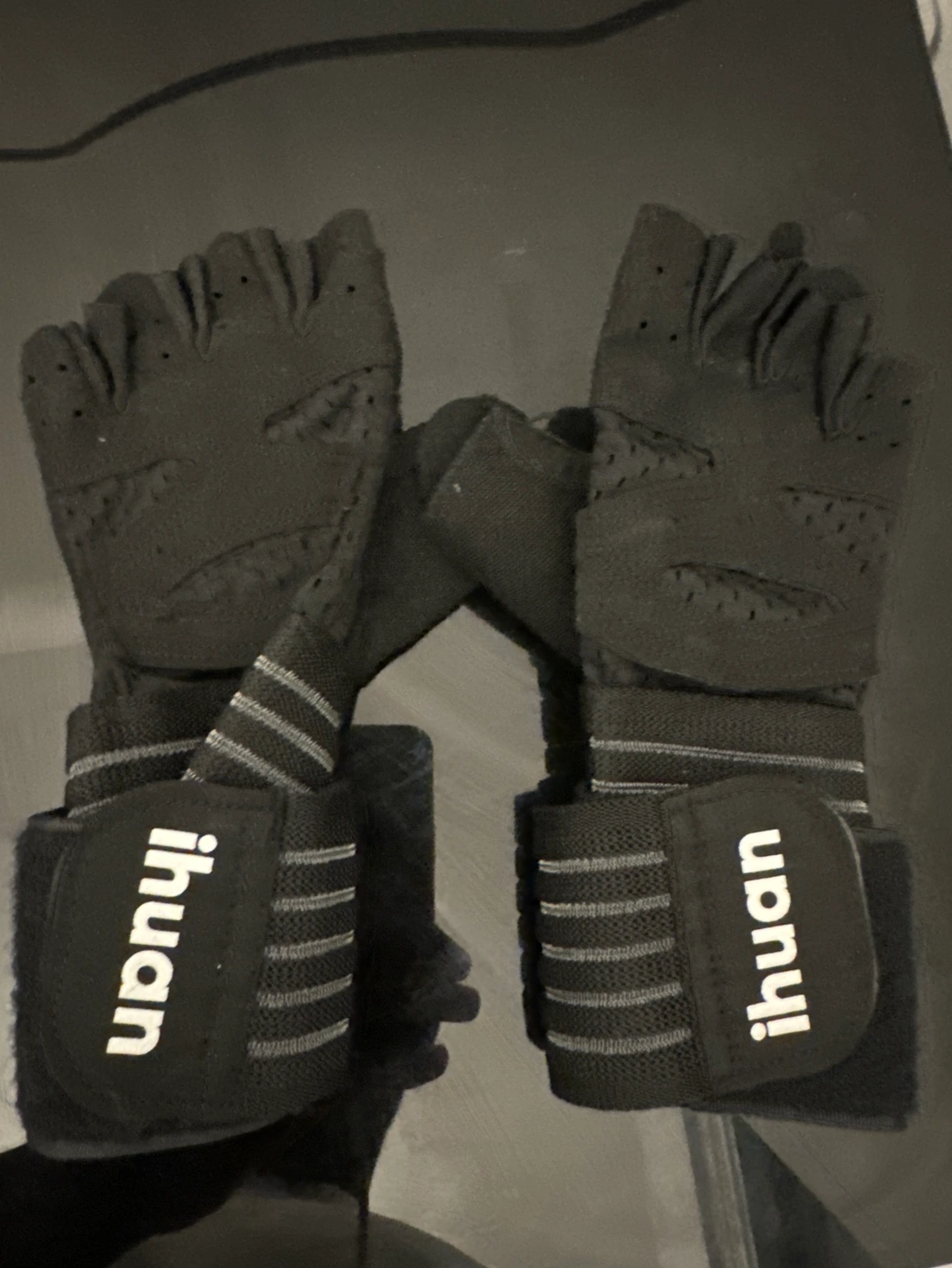60Pair of black weightlifting gloves with wrist wraps. The gloves are fingerless with mesh panels. The wrist wraps have the word "ihuan" printed on them.