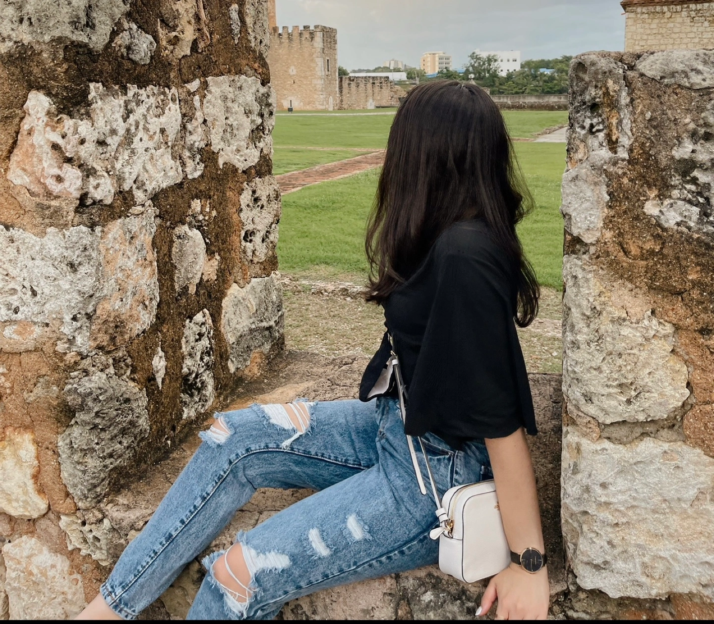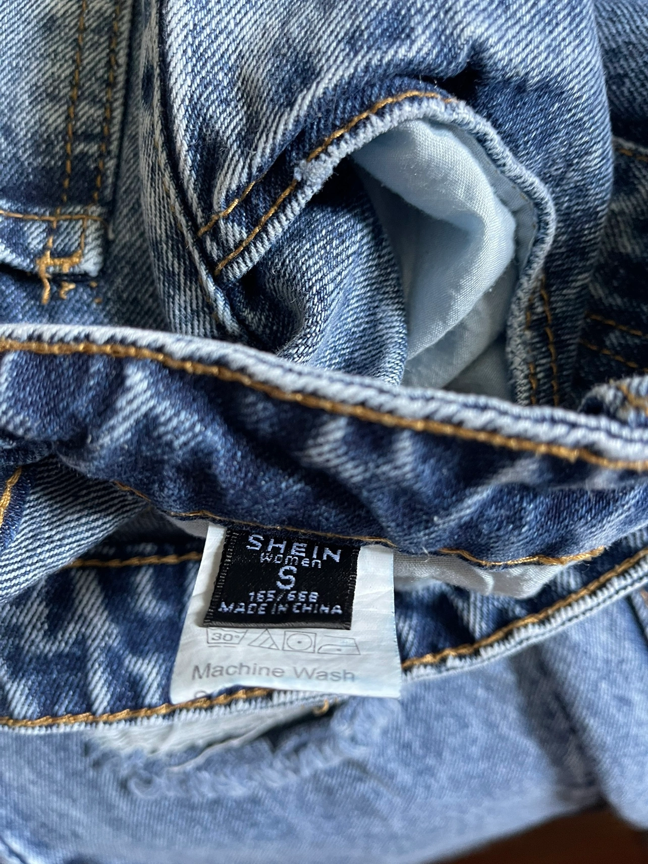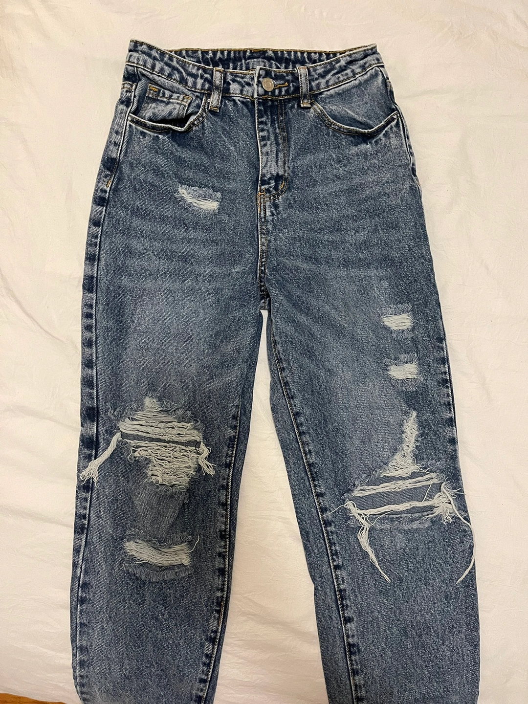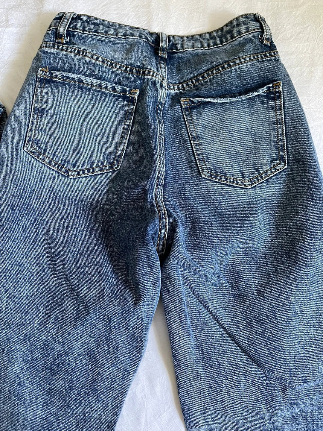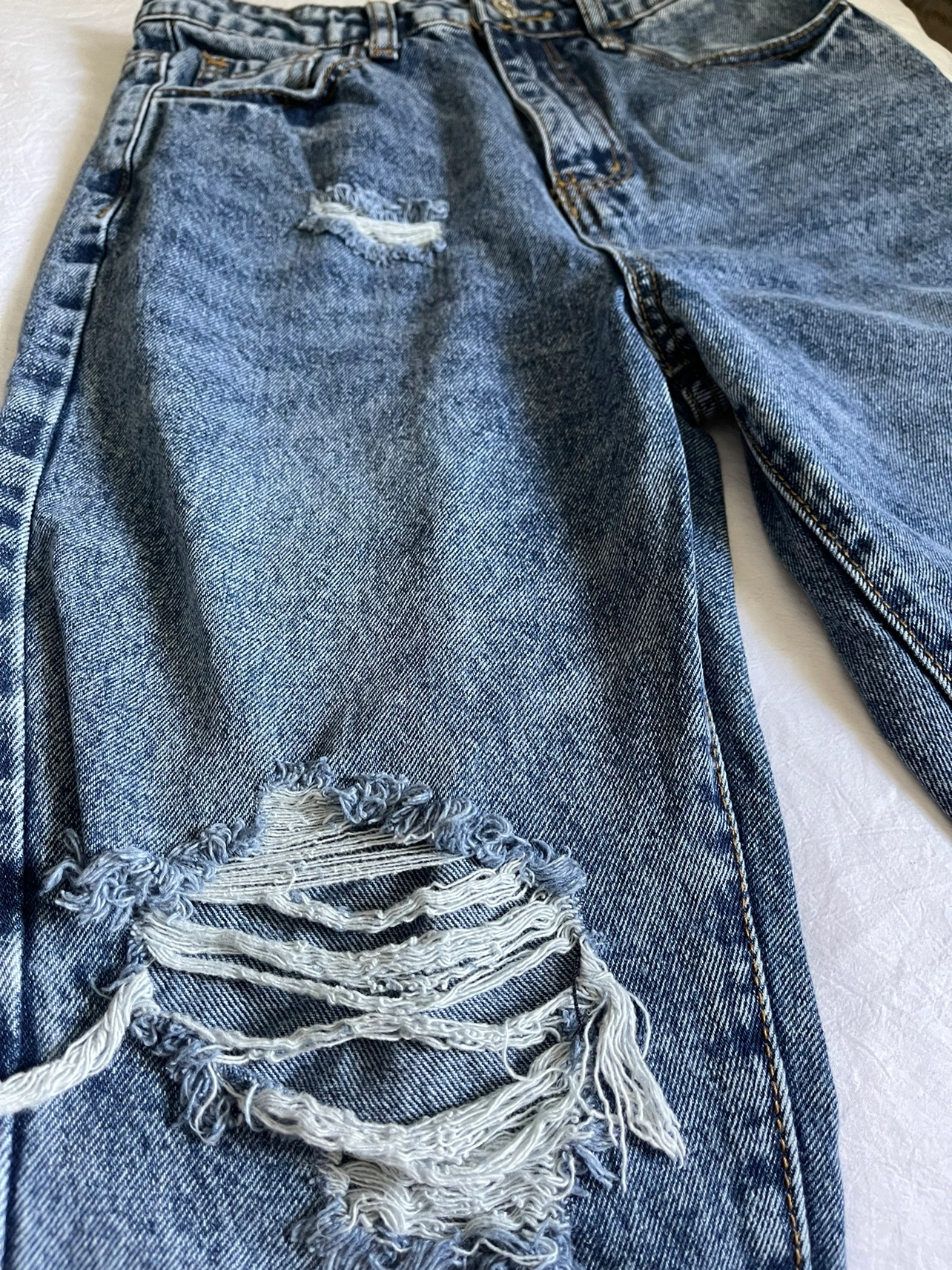 These jeans are a light wash with distressing throughout. High-waisted. Size S.