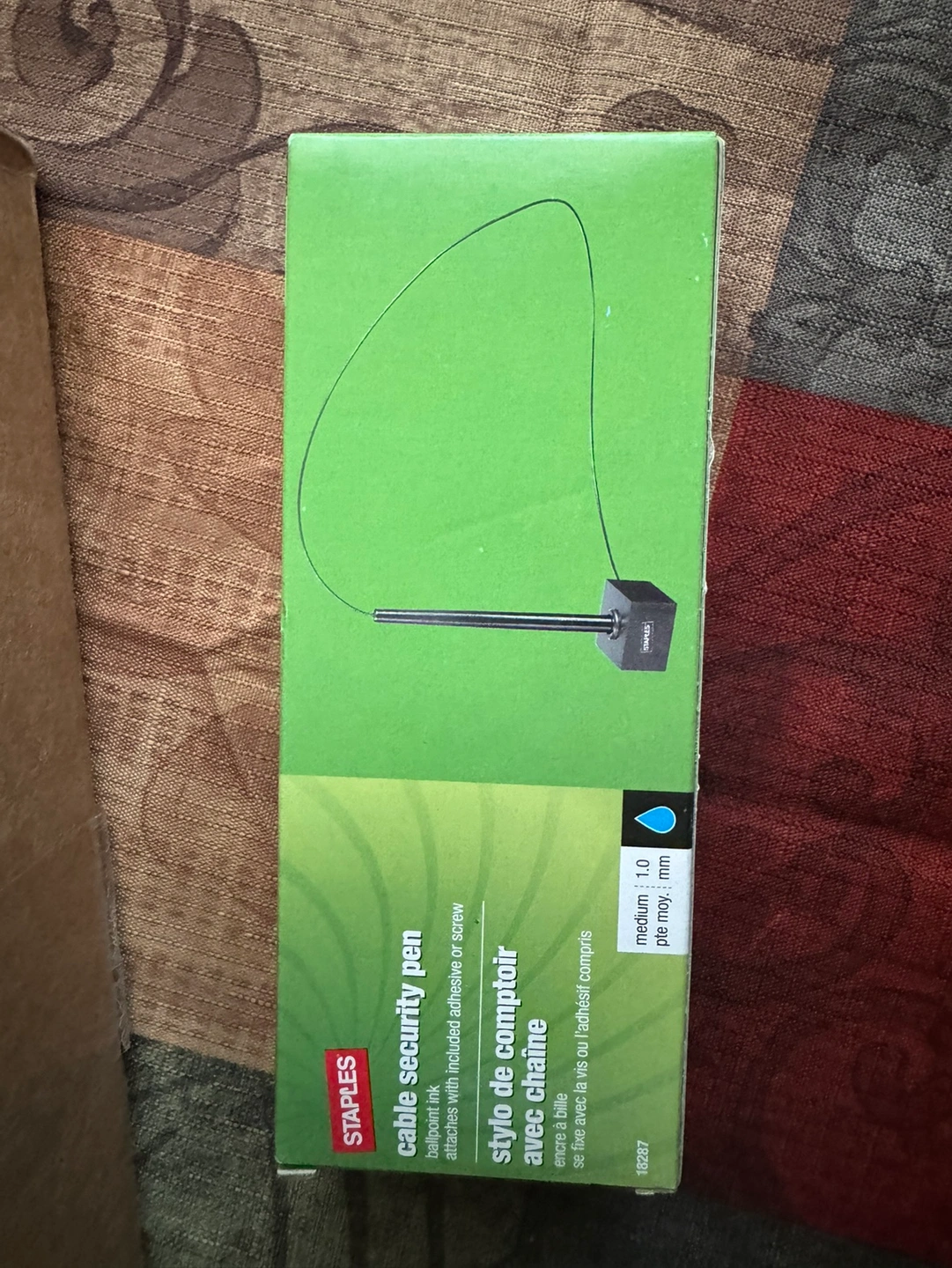 Ballpoint pen with included adhesive or screw. Attaches with a chain. Comes with a black ink cartridge.