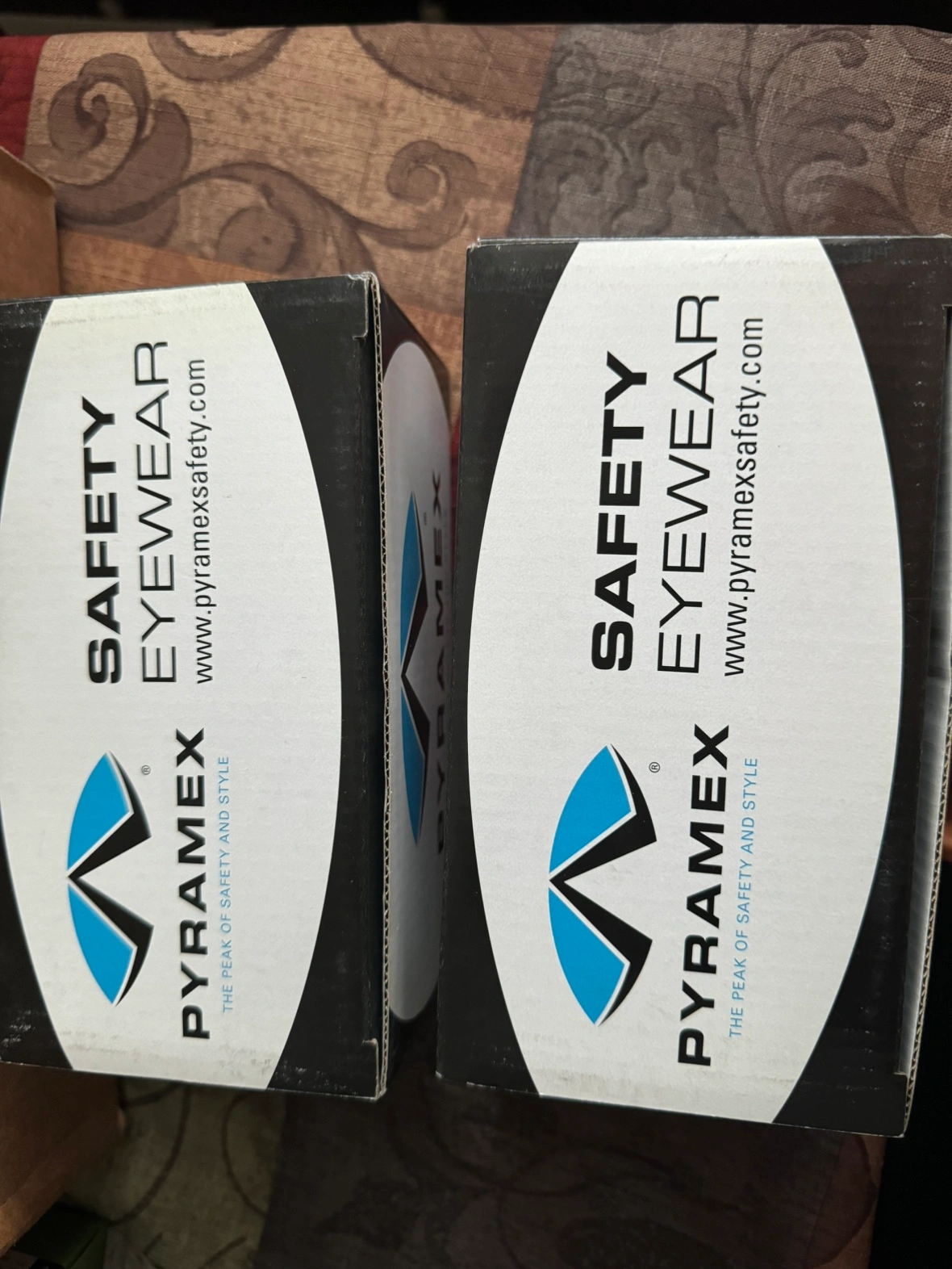 Two pairs of Pyramex safety eyewear in their original packaging.