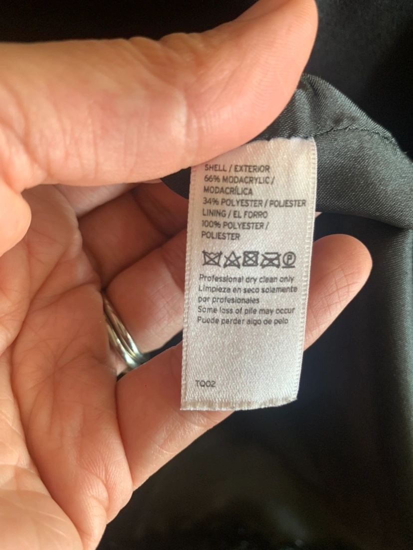 961A long black faux fur vest from Topshop. Shell is 66% Modacrylic and 34% polyester. Lining is polyester. Warm and stylish for the fall/winter. Measure: From neck to bottom 34 inches From armpit to bottom 25 inches