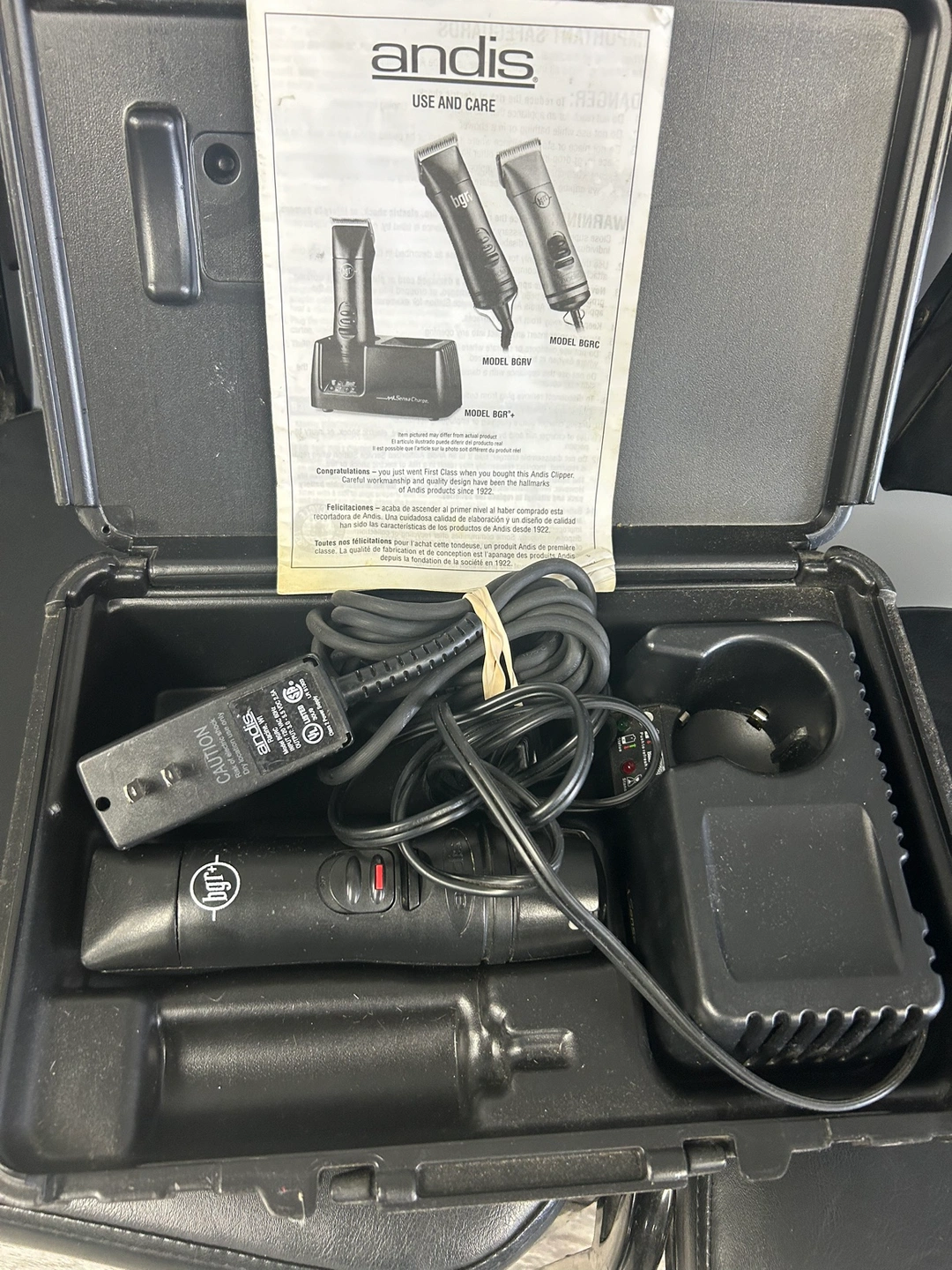 Andis hair clipper with charging station and hard case.