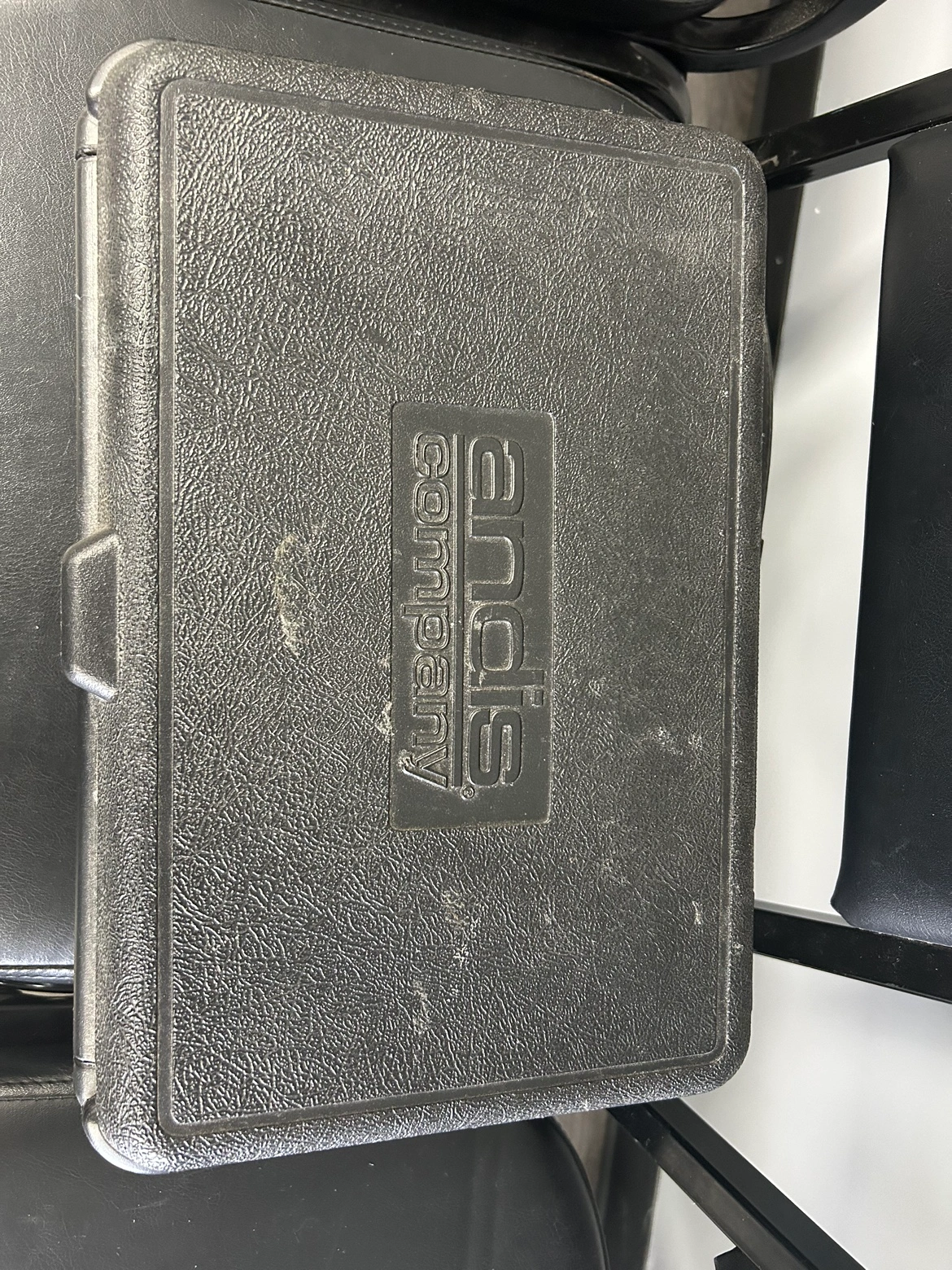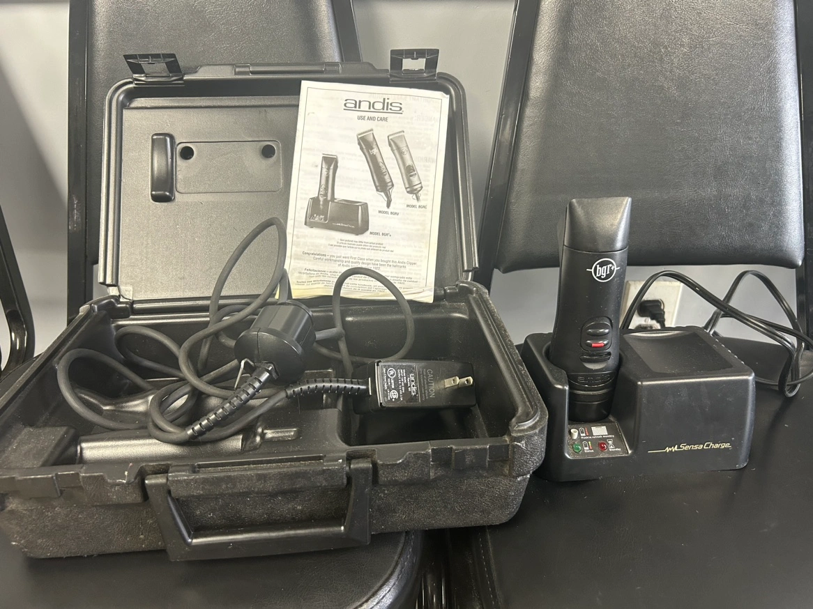 Andis hair clipper with charging station and hard case.