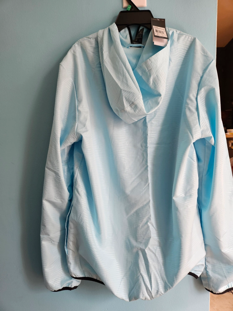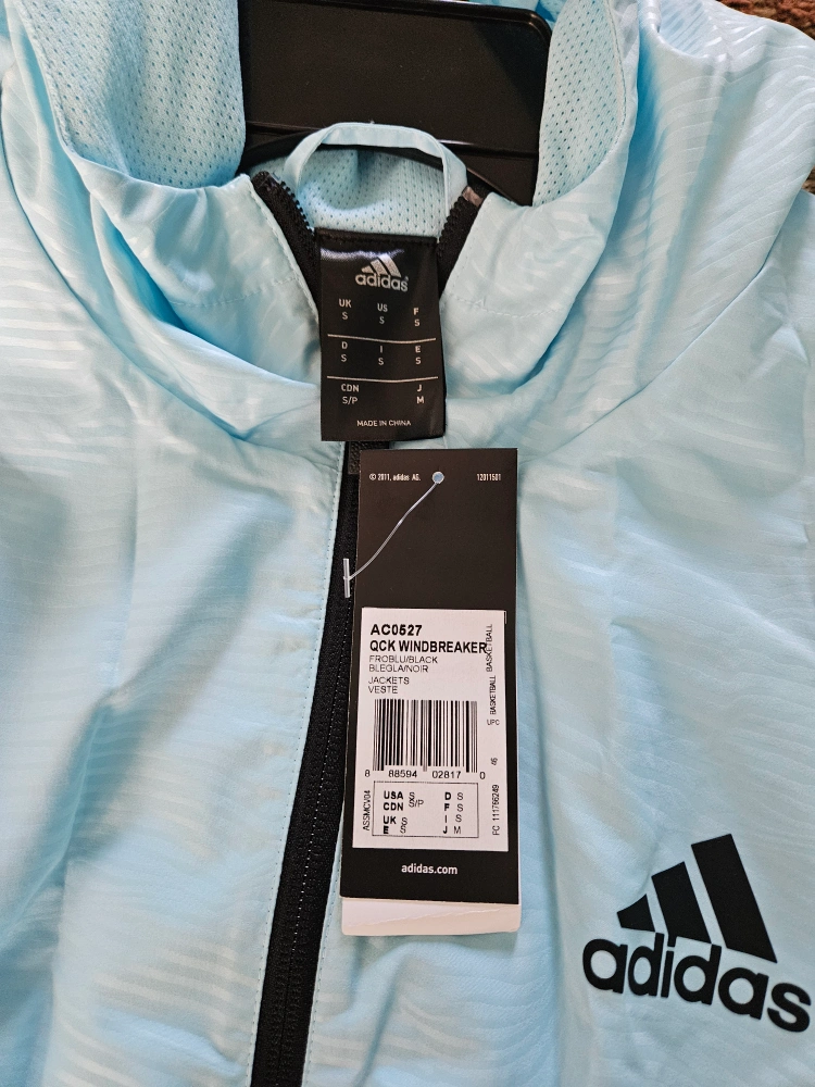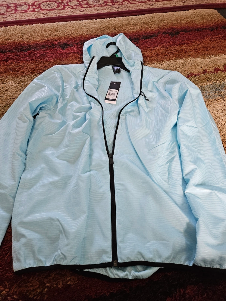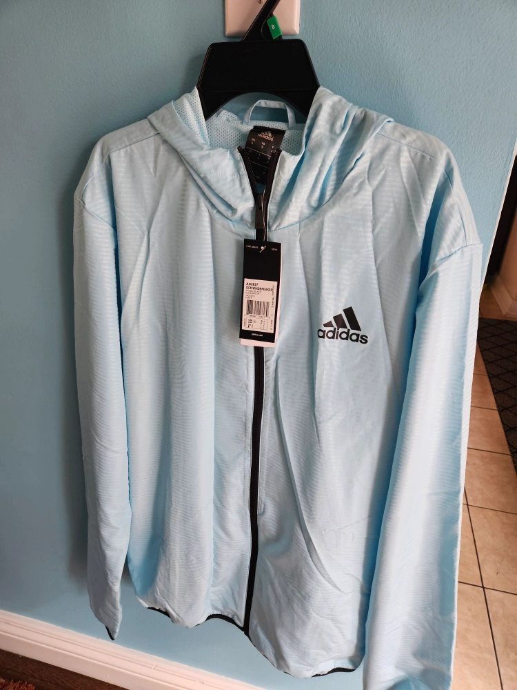 Blue Adidas Windbreaker jacket with black trim. unisex Size S. New with tags. never been worn original price 120 plus if ad is up it's available