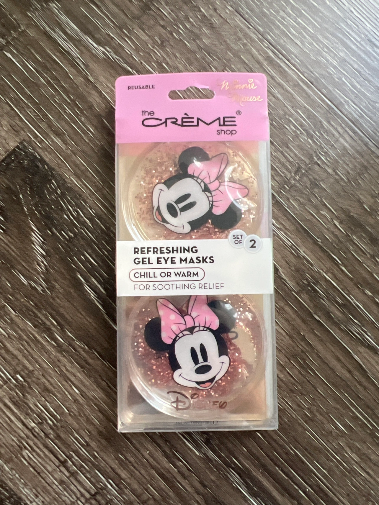 Reusable gel eye masks featuring Minnie Mouse. Chill or warm for soothing relief.