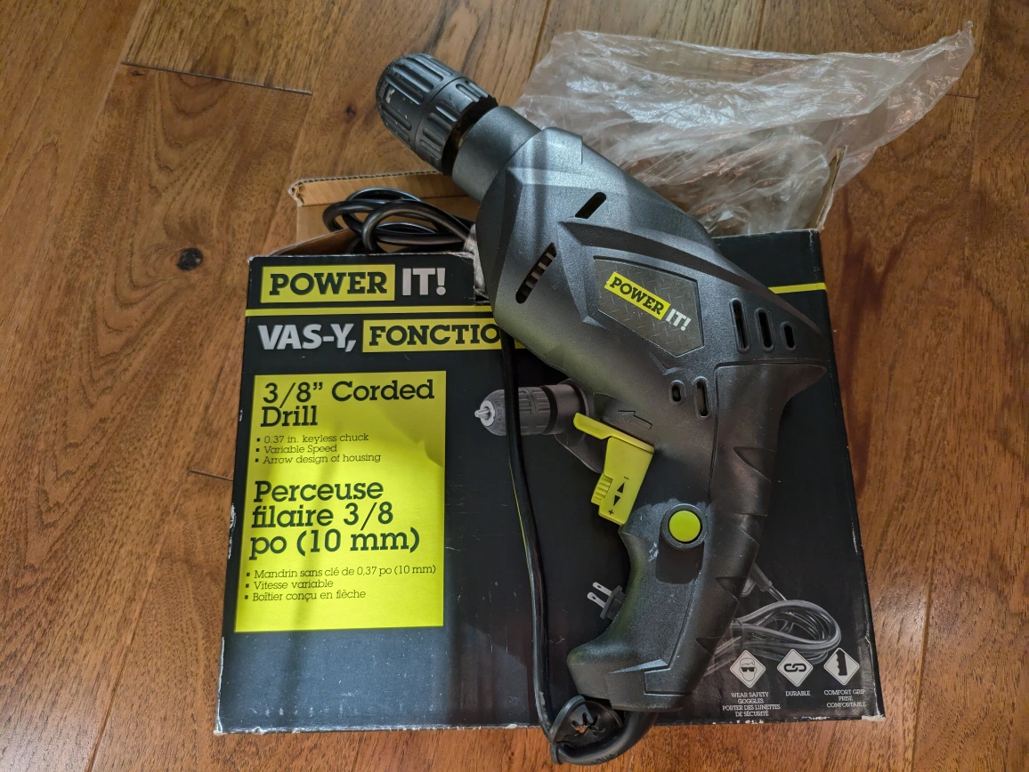 Corded drill with keyless chuck. Variable speed. Manual included.