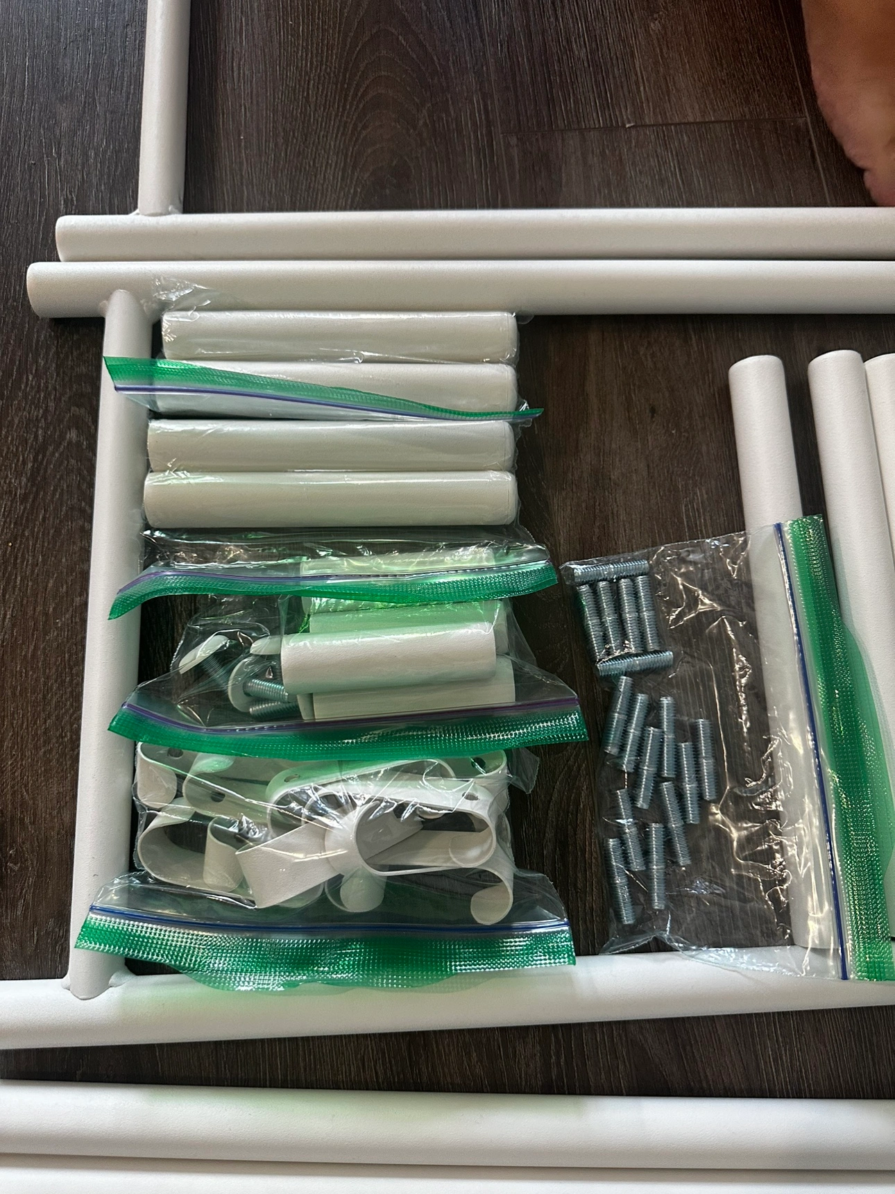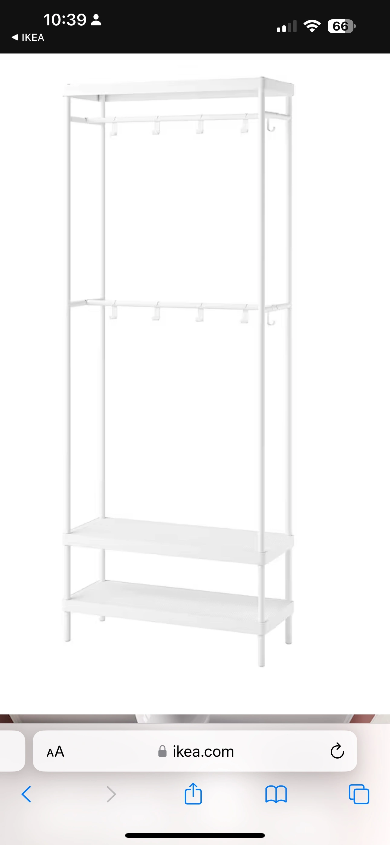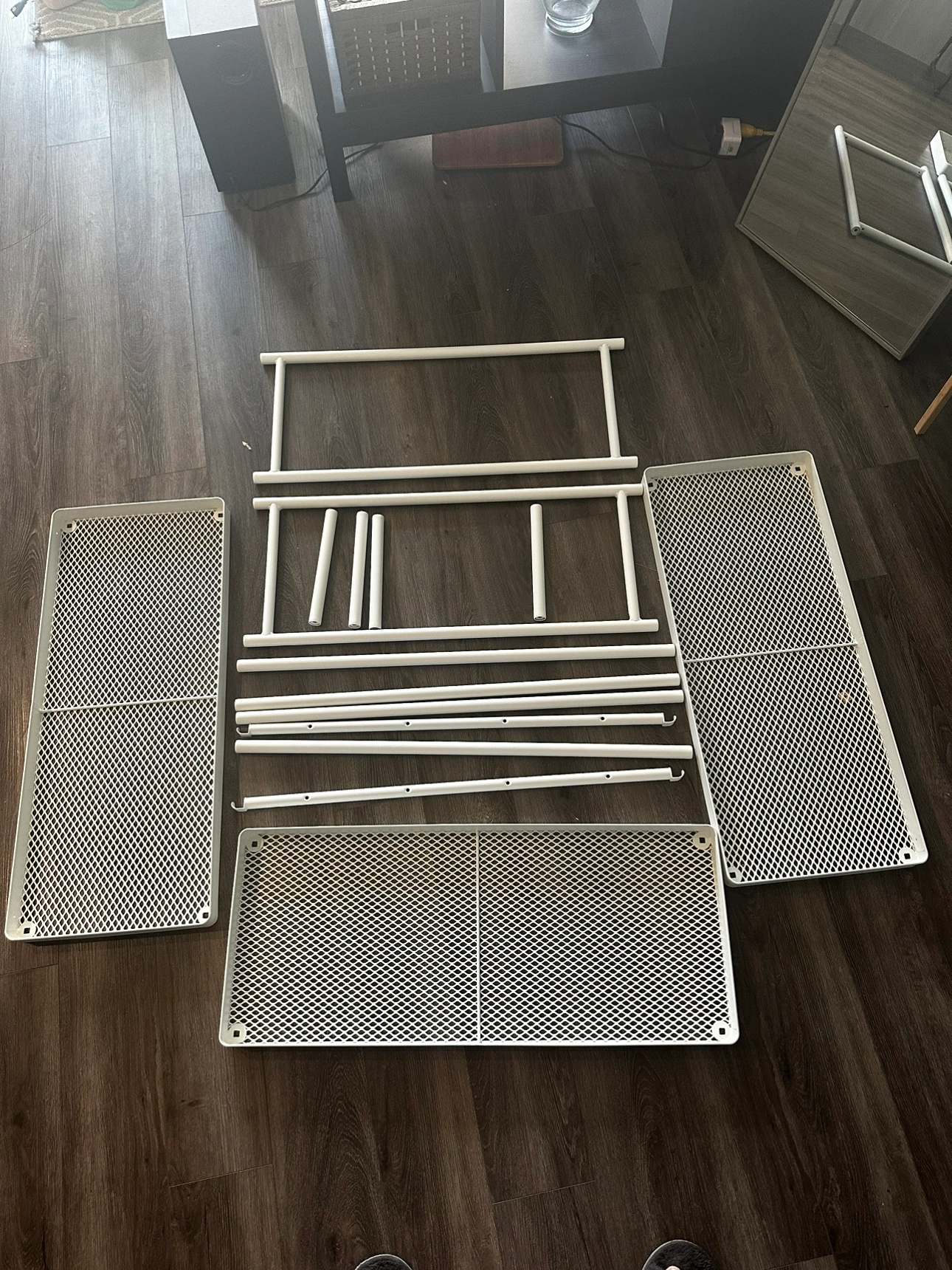 White shelving unit, comes with all parts. Some parts are in bags. Used for a couple of months. Selling this one because I have a dresser now and decluttering some furniture for better space in our apartment.