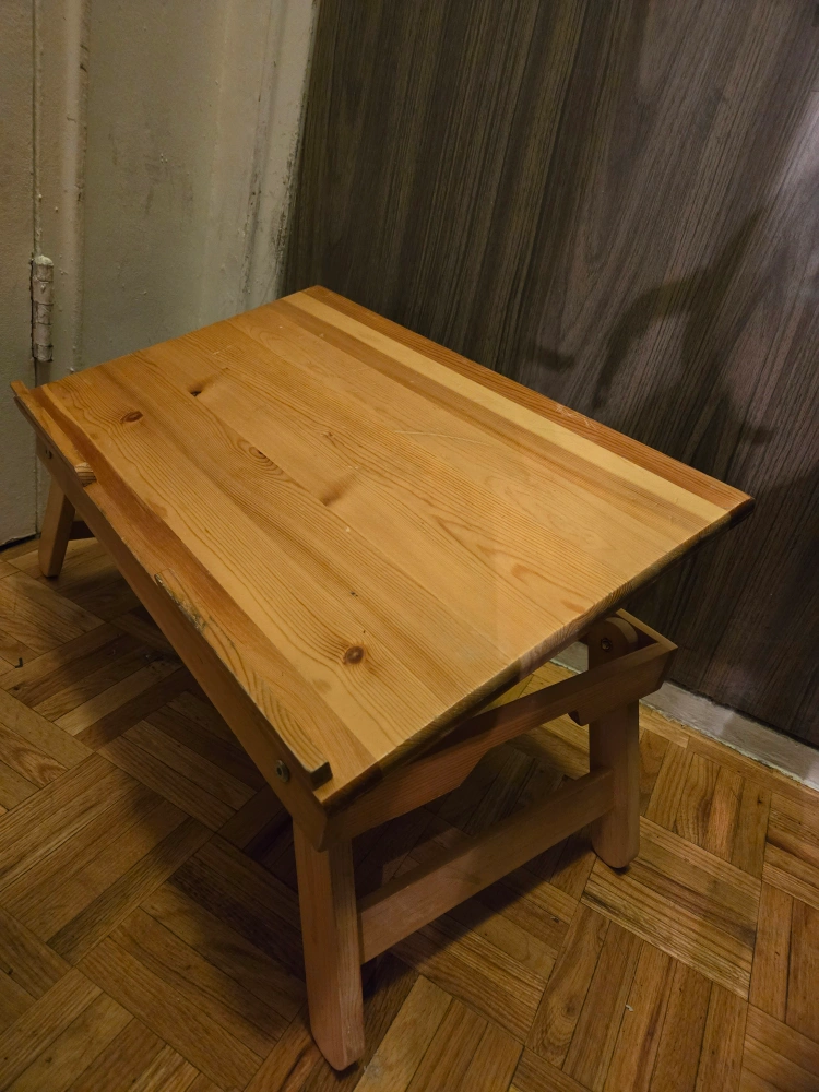 Small, wooden folding table. Perfect for breakfast in bed, or using as a laptop stand. The angle of the table is adjustable, and the legs fold down flat for storage. It's been used and is showing signs of wear