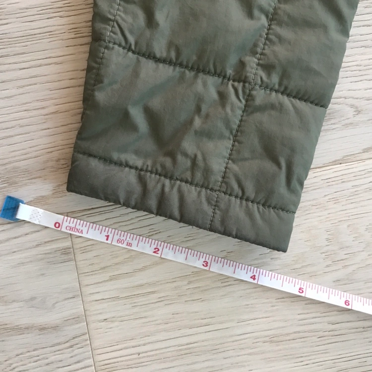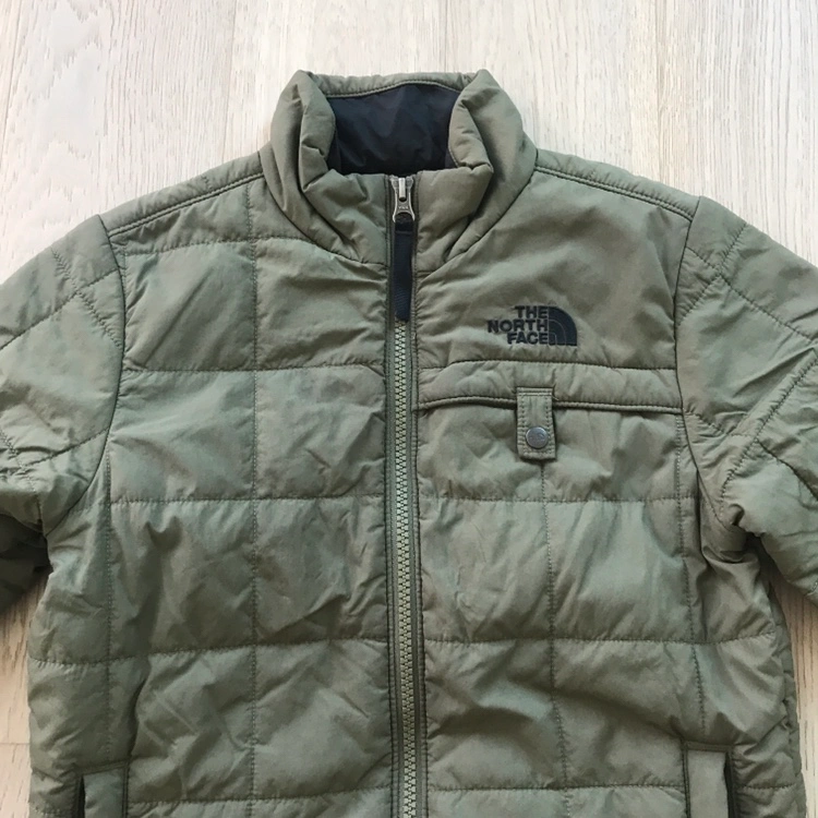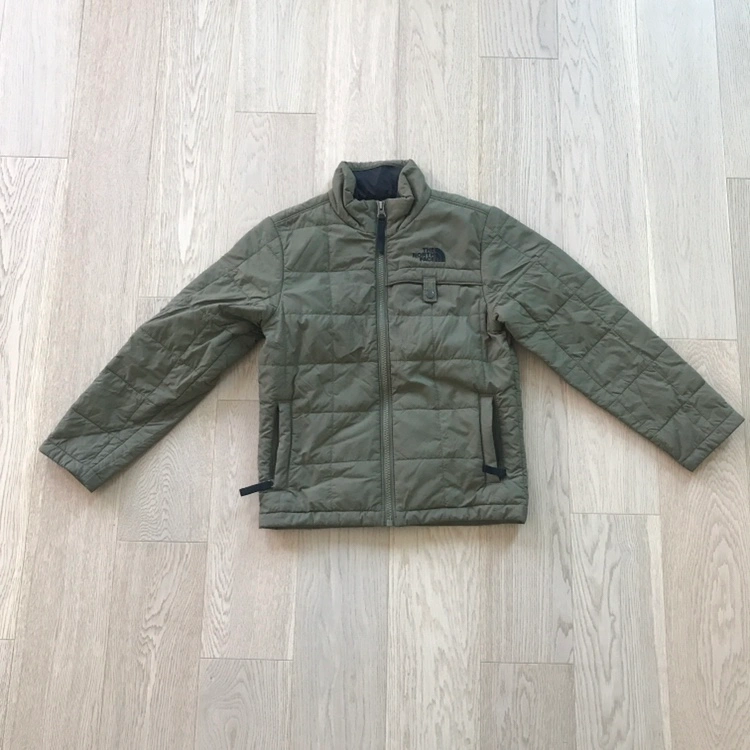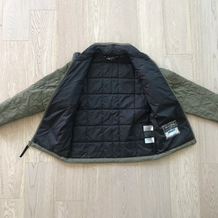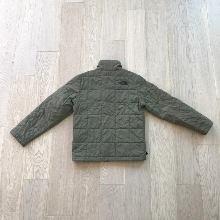 Green quilted jacket with a zipper closure. The jacket has a pocket on the left chest and two zippered pockets on the sides.