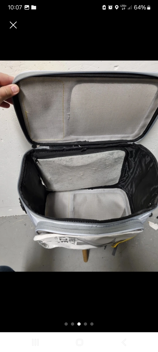 Grey Petkit Breezy Xzone pet carrier. It has a mesh window for ventilation and a pocket on the front. The carrier is suitable for small dogs or cats. There is a zipper on top that can be opened for easy access.