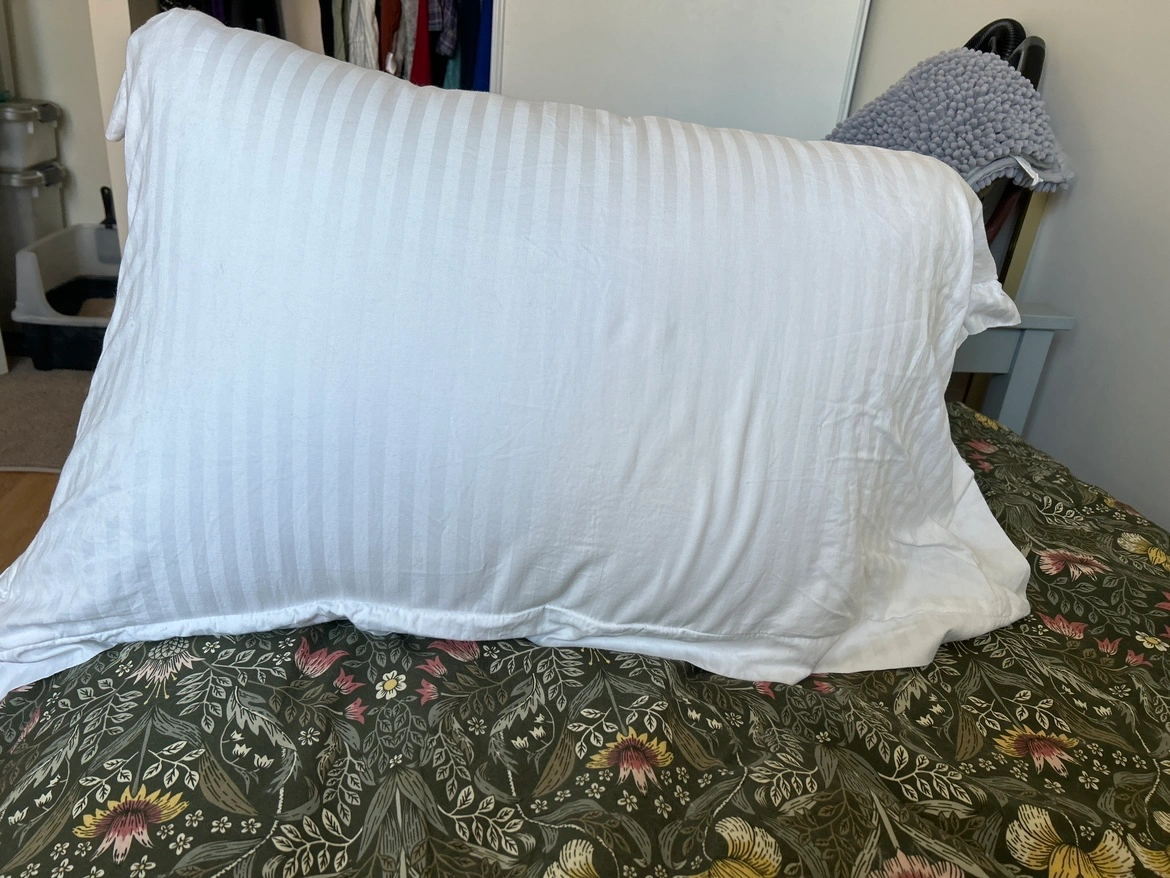 A pair of hypoallergenic fill queen size pillows. Never slept on. Have been stored in pillow cases as shown in photo, so are clean. Comes with the pillow cases to keep them that way. The cases are from Down Under and the pillows from Amazon. Too big for me and I could not face trying to package them up for return. I have a cat, which is why the cases are included.