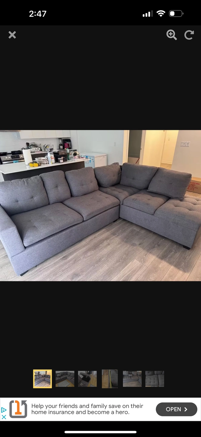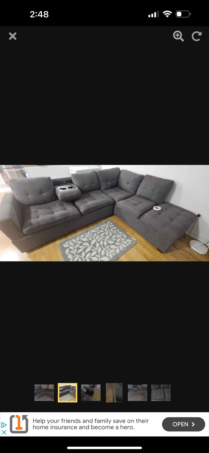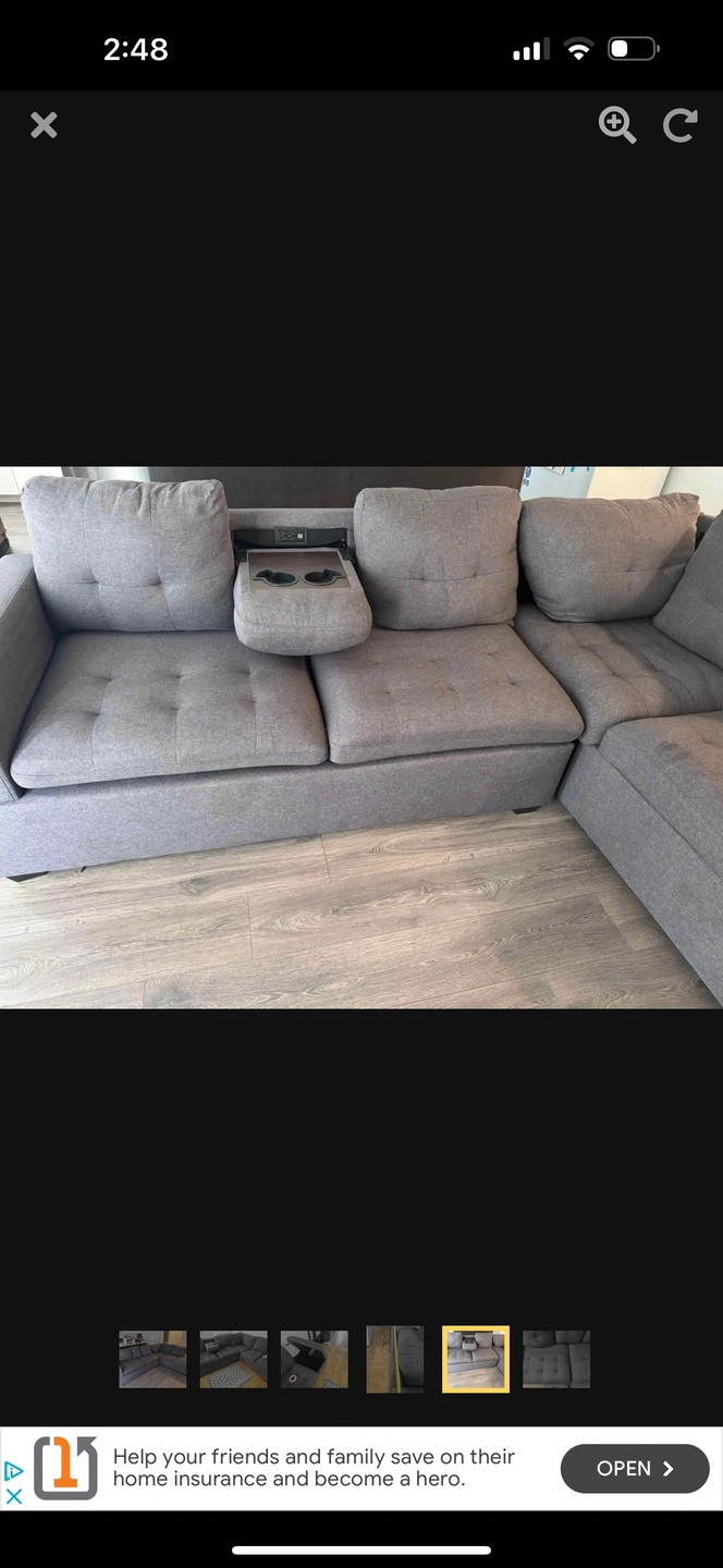 Used sectional sofa with lift up storage compartment, 2 power and 2 usb ports behind the back cushion with 2 cup holders,