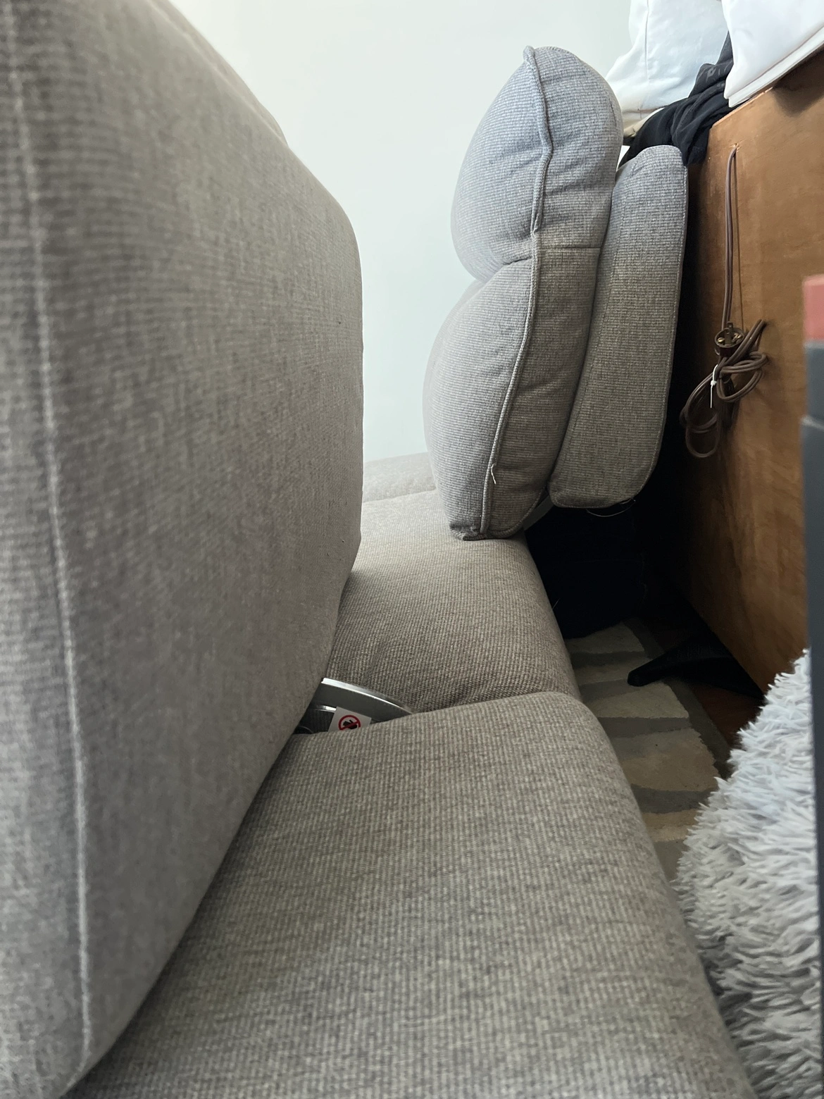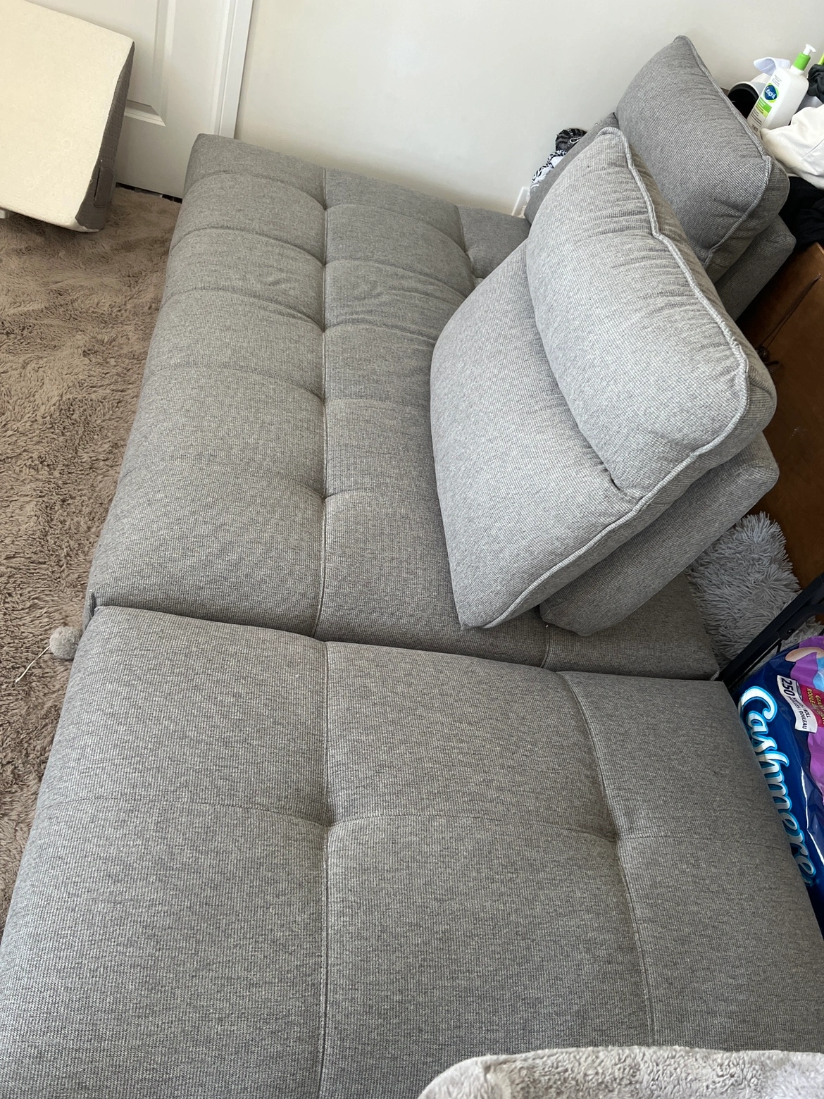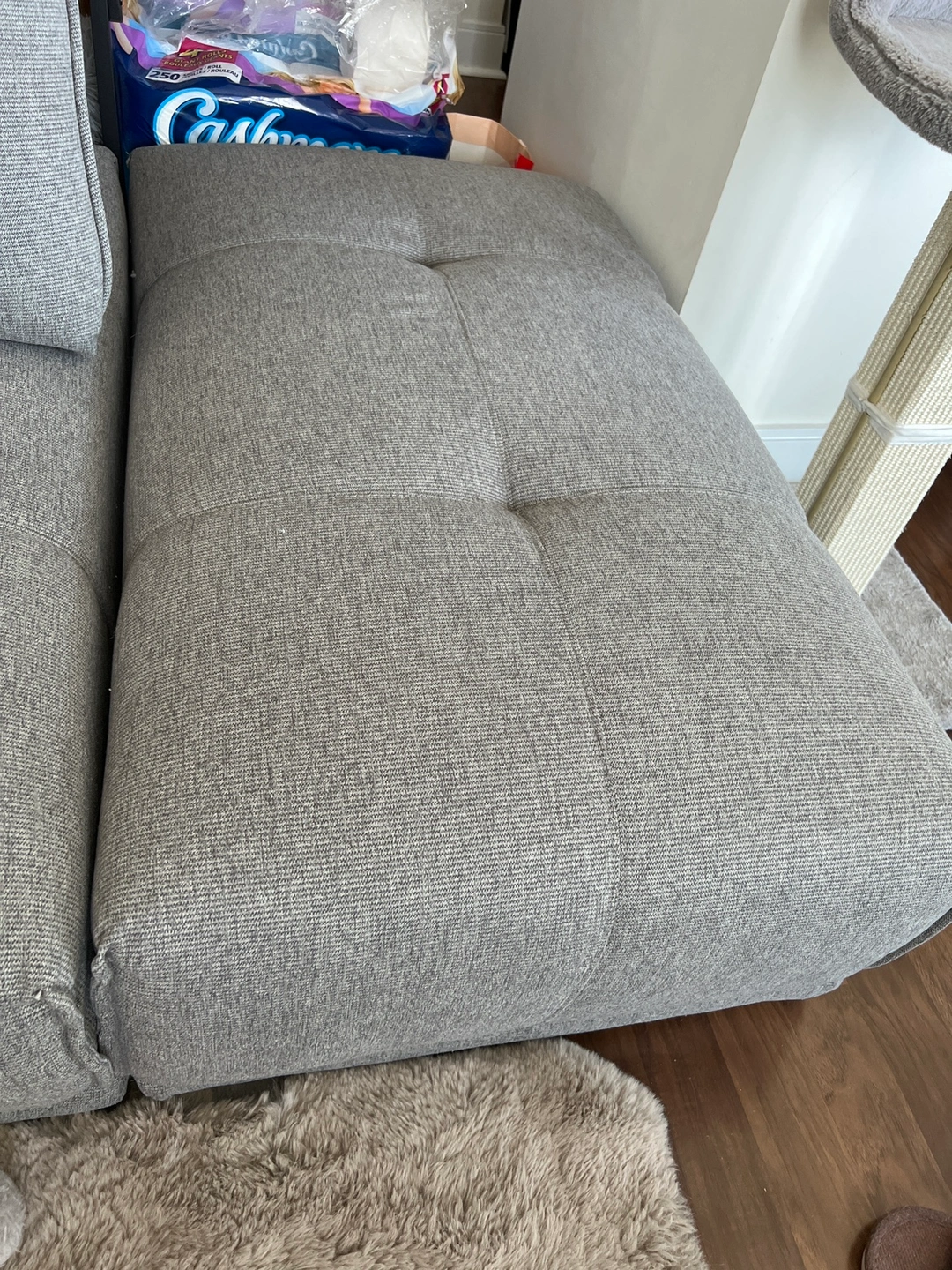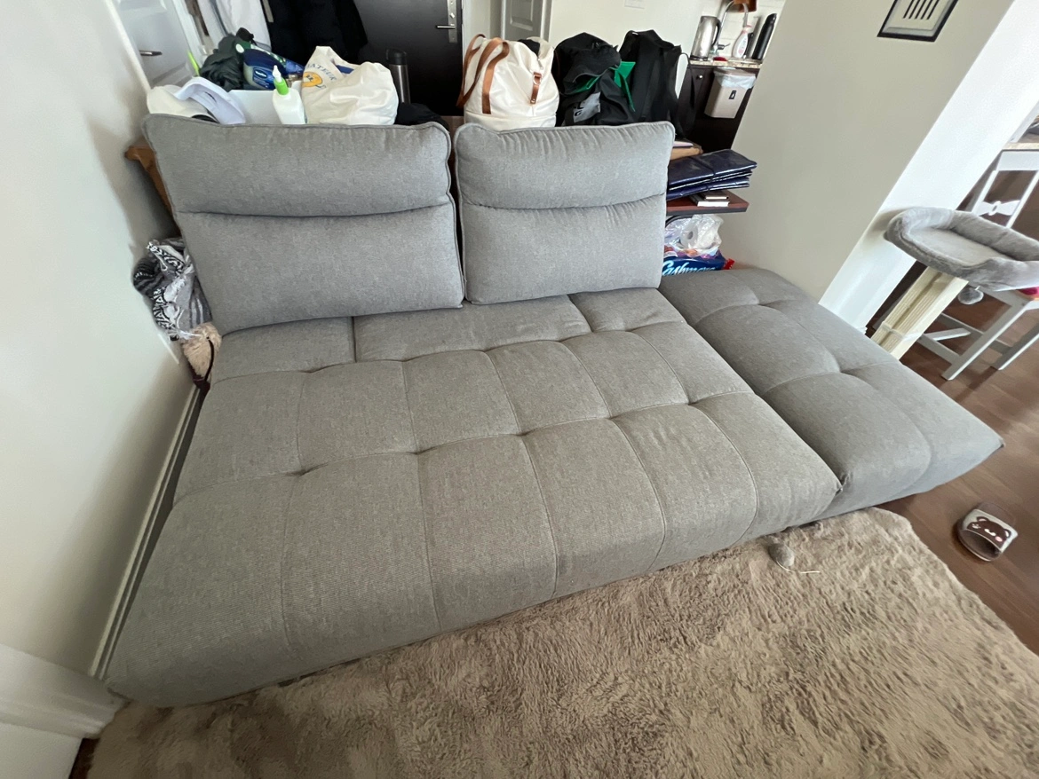 105This is a comfy and stylish sofa that is perfect for any living room. It has a soft, grey fabric and a modern design. It comes with two back cushions and a chaise lounge. The sofa is in great condition with adjustable backrest cushion. Purchased mid-May this year with receipt.