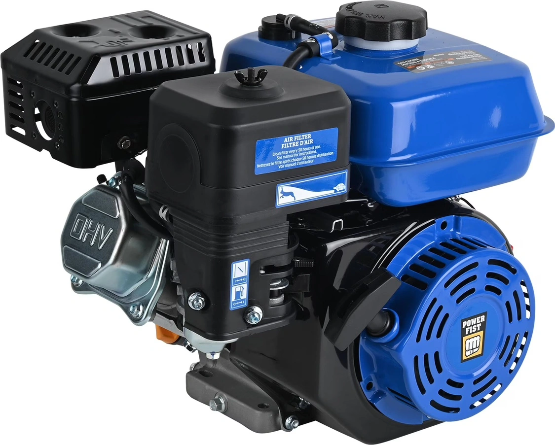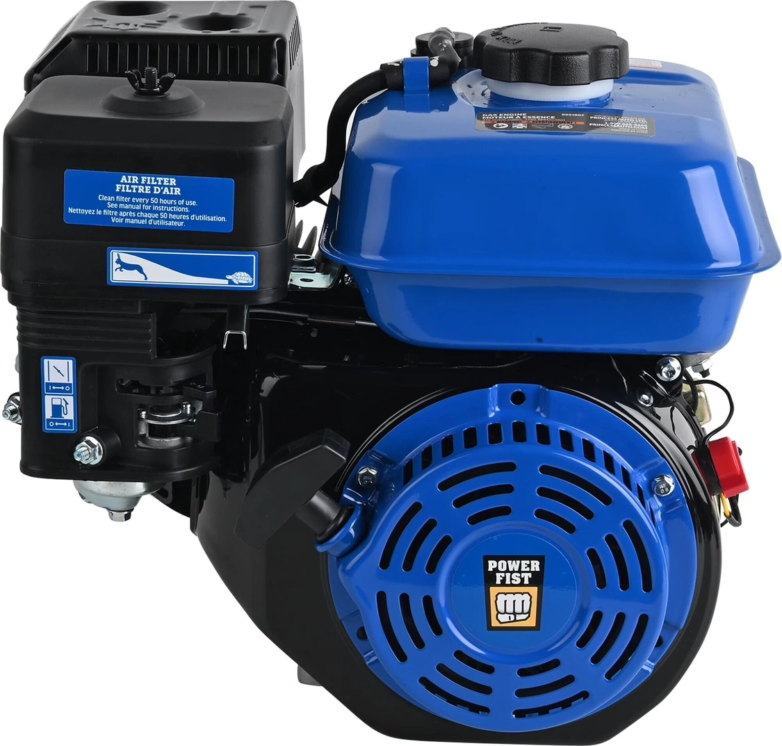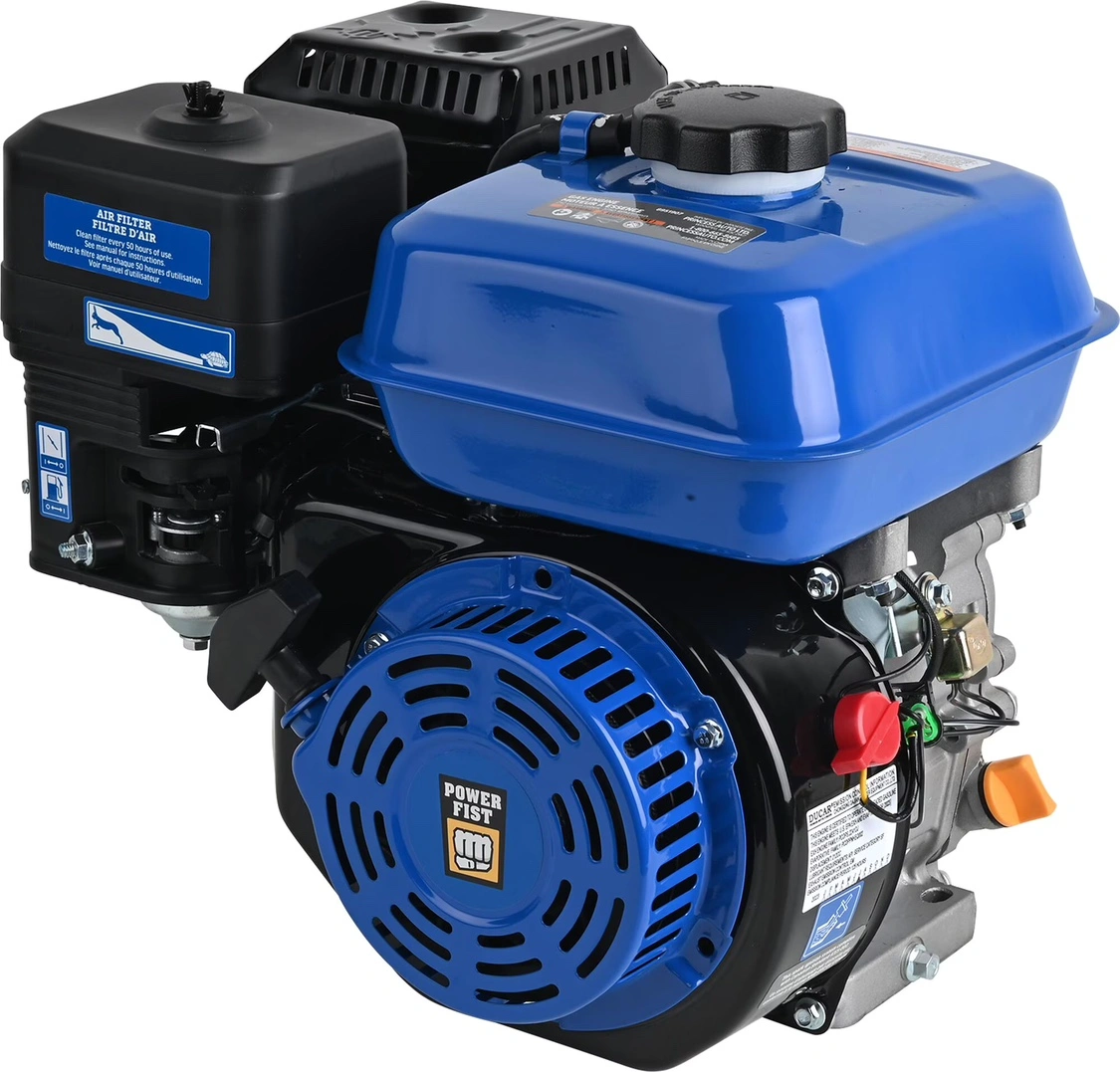 49This is a Power Fist 6.5 HP gas engine. It is blue and has a black air filter. It comes with a wrench. It has a horizontal shaft. It comes with an oil filter. It includes a fuel tank and oil cap. It is designed for general purpose use and may be used to power a variety of equipment. It is a great option for those who are looking for a reliable and powerful engine for their applications.