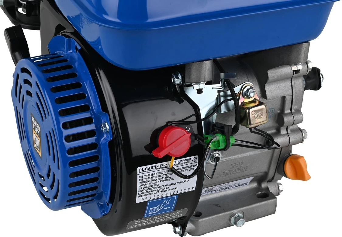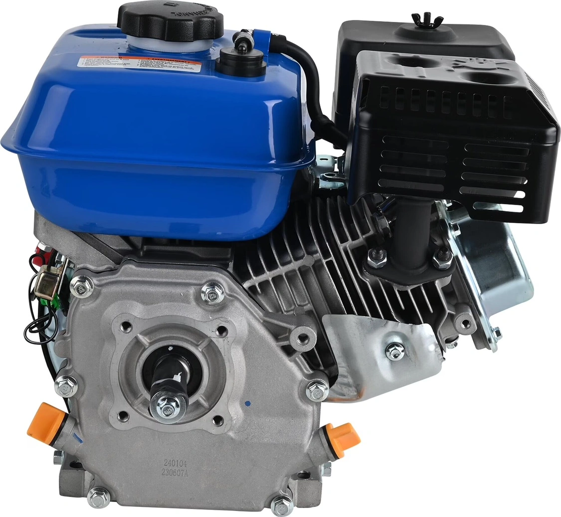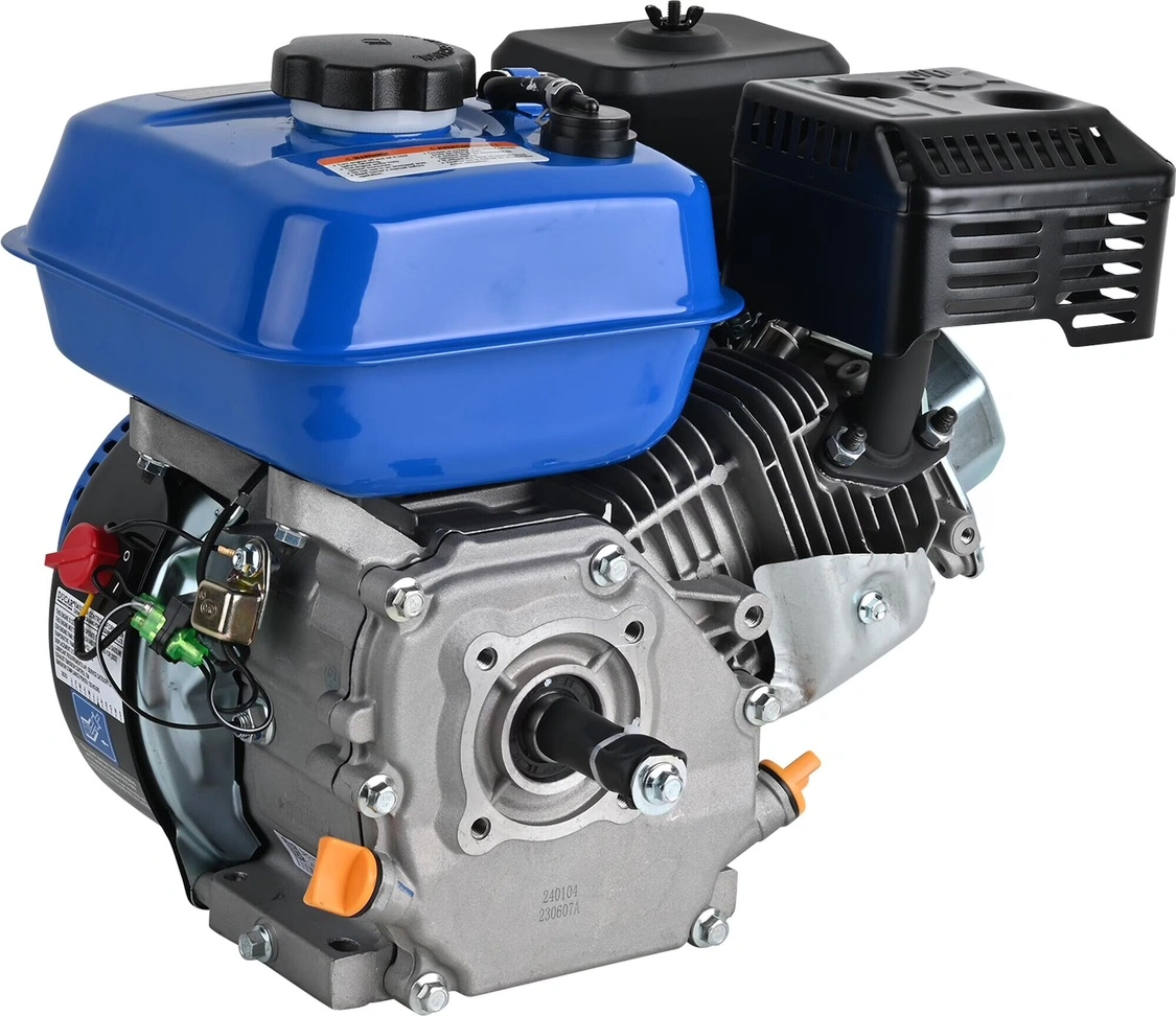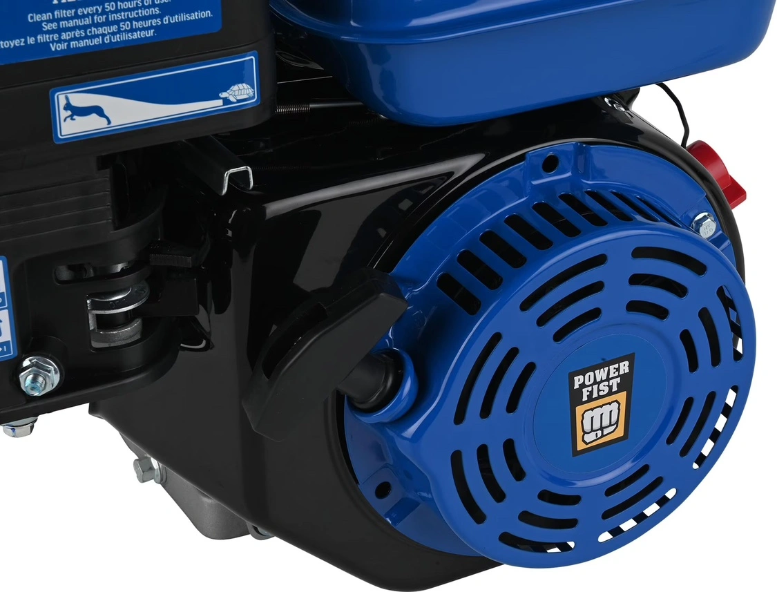 49This is a Power Fist 6.5 HP gas engine. It is blue and has a black air filter. It comes with a wrench. It has a horizontal shaft. It comes with an oil filter. It includes a fuel tank and oil cap. It is designed for general purpose use and may be used to power a variety of equipment. It is a great option for those who are looking for a reliable and powerful engine for their applications.