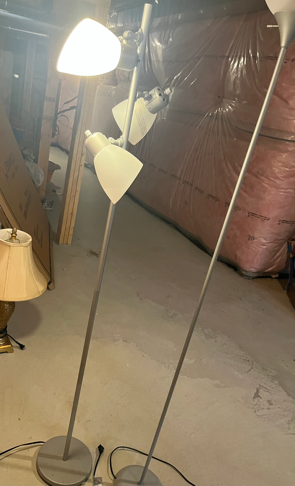 Two floor lamps with adjustable heads and white lampshades. The lamps have a silver finish and come with the cords and plugs. They are currently functioning but may need new bulbs. The lamps can be separated and sold individually if desired. Please inquire for more information.