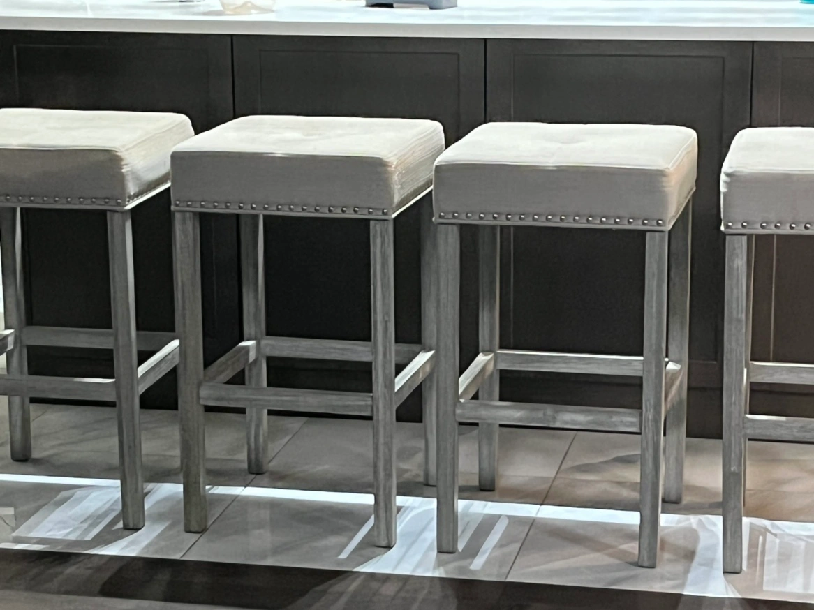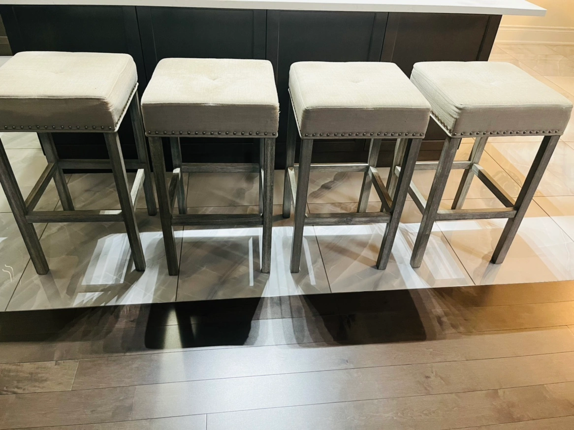Moving Sale- Four bar stools with a light grey fabric seat and a light grey wood frame.