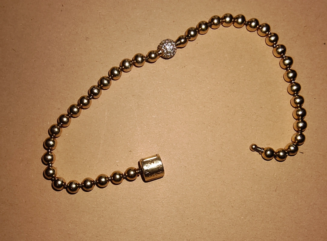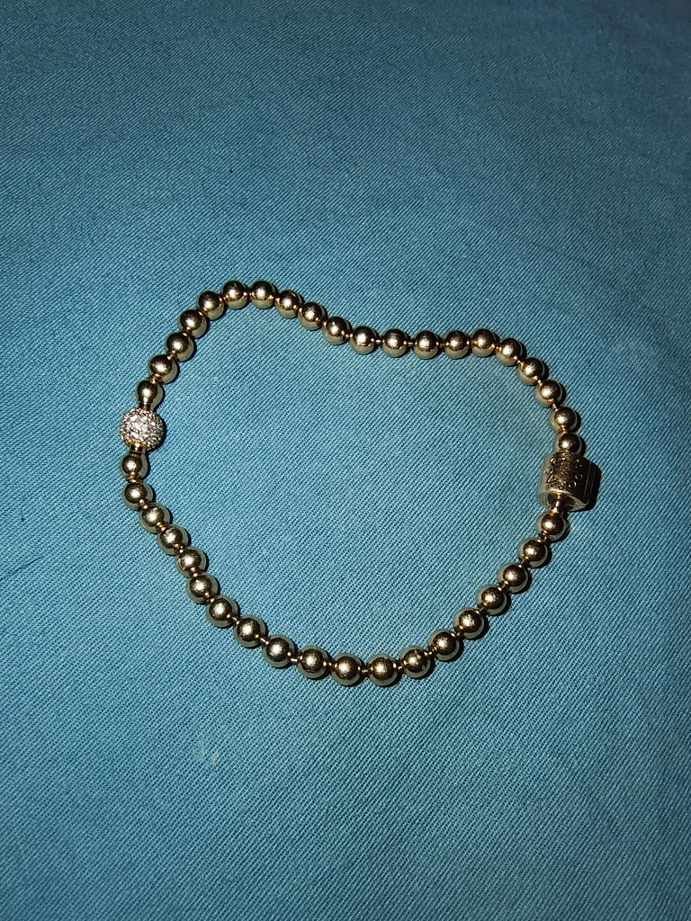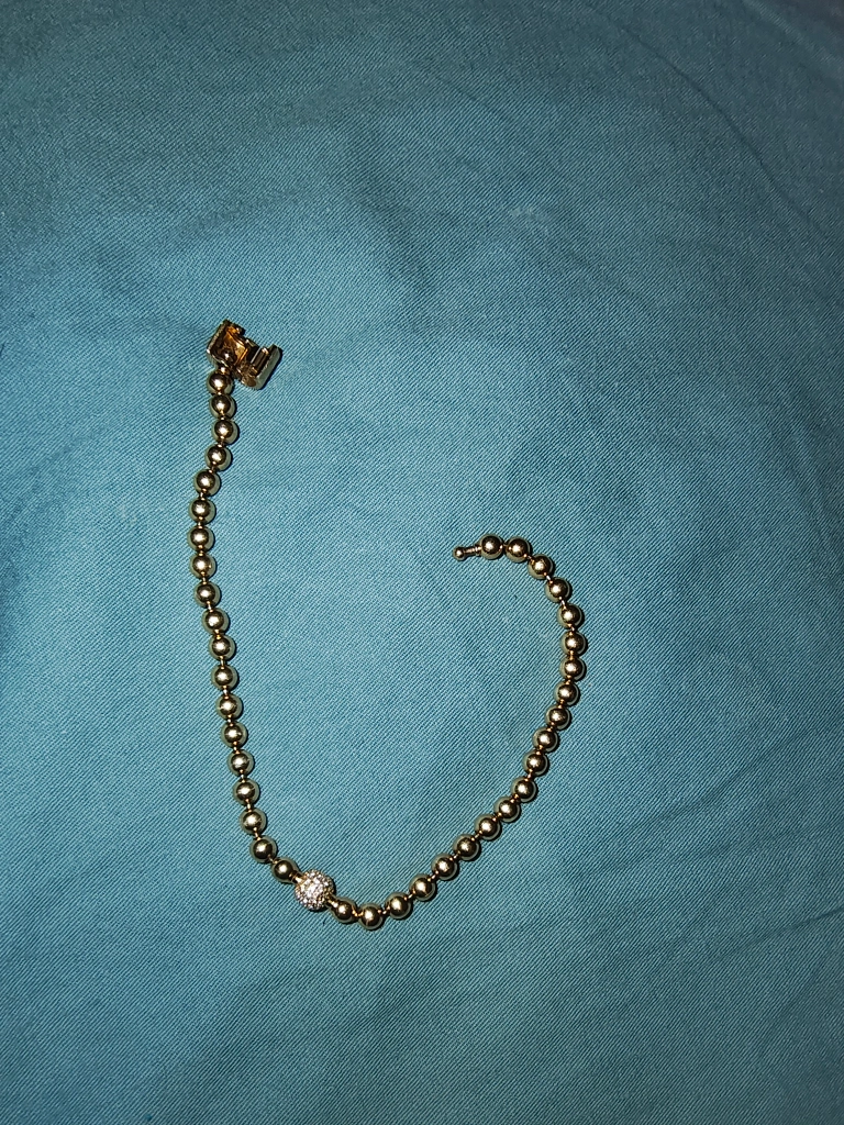 A 14k gold beaded bracelet with a diamond accent on one bead. The bracelet is about 7 inches long and has a clasp closure.A little bit of use. Bought it about a year ago.Price negotiable.No box.Cash only.