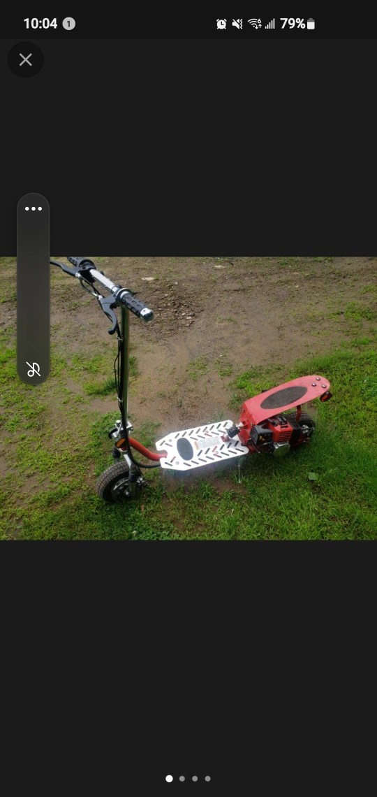 A gas-powered scooter. It has a red frame, black wheels, and a silver footboard. The scooter has a single front wheel and a single rear wheel. It also has a black handlebar with a throttle and brake lever. It is powered by a small gas engine. Runs great