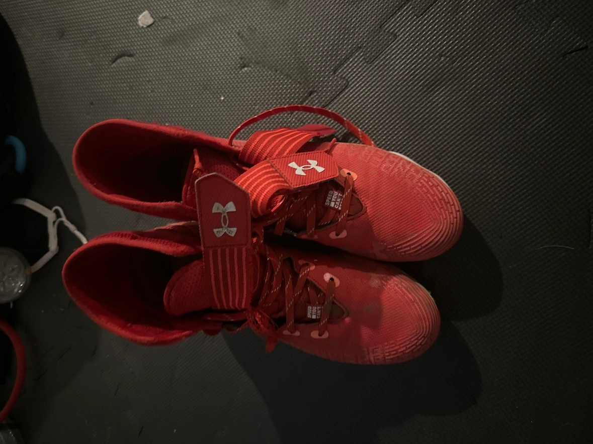 Red football cleats with a white sole and Under Armour logo on the side.Size 8.5 Men’s