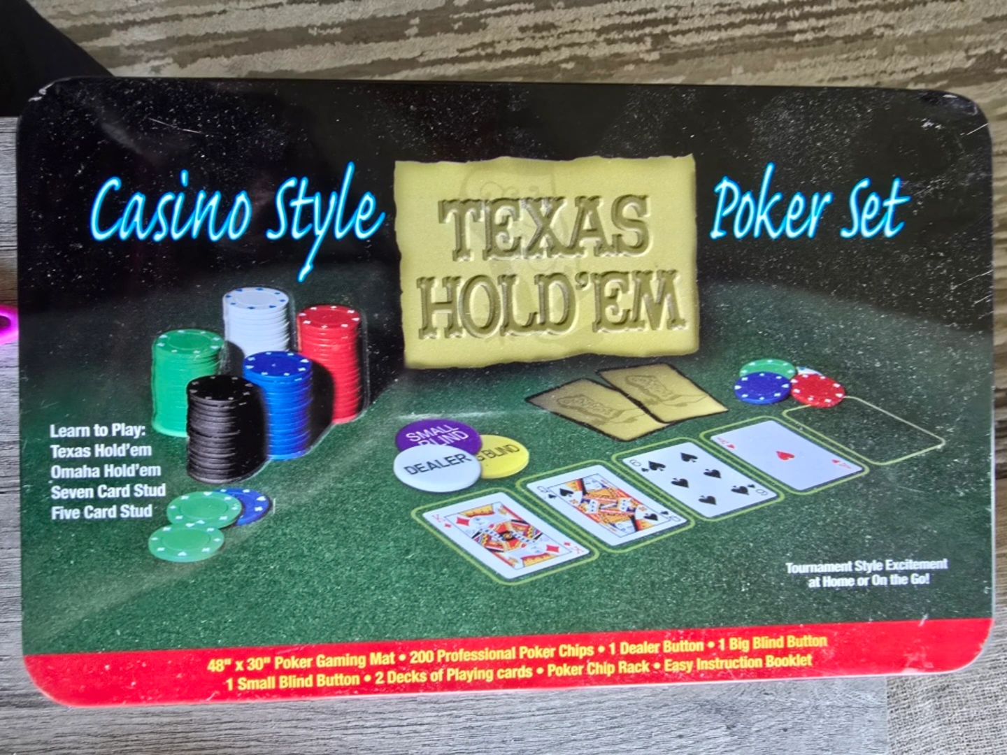 This poker set includes a poker mat, chips, cards, a dealer button, a big blind button, a small blind button, a chip rack, and an instruction booklet.