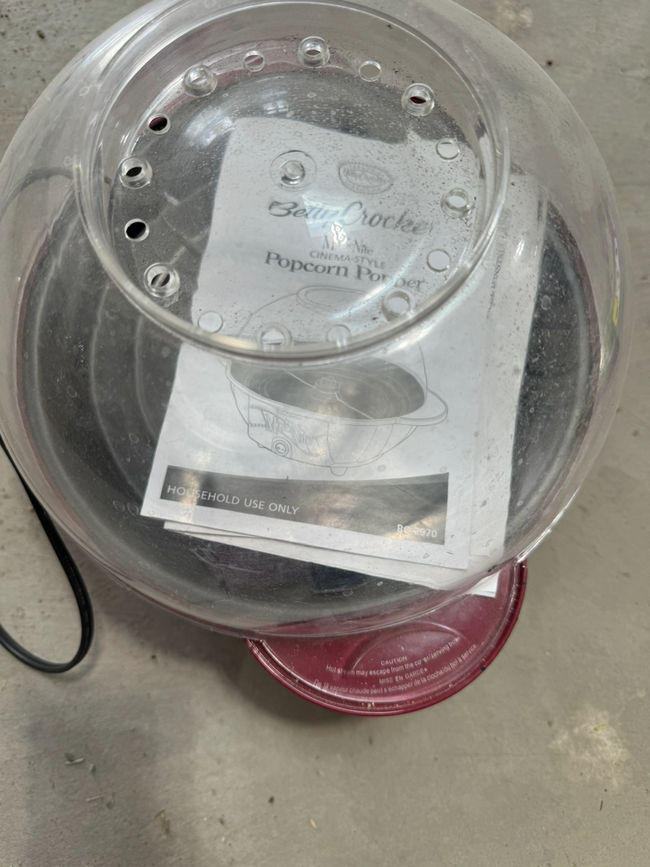 Buy & SellBetty Crocker Popcorn PopperBetty Crocker Popcorn Popper$8The popcorn maker was used only once has a clear plastic lid and comes with instructions.ConditionLike newWHERE TO MEETCheck LocationView MapSELLERFarzanaRanchlands442 reviews0 chats·0 favorites·38 viewsSEND CHAT TO SELLERHi Farzana! I’m interested in your listing.Hi Farzana! I’m interested in your listing.Get the Karrot app to chatSign In to chat