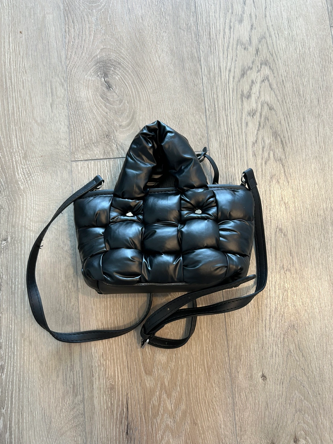 This is a small black padded handbag with an adjustable strap. It can be worn as a crossbody bag, shoulder bag, or handheld. Used only once, excellent condition.