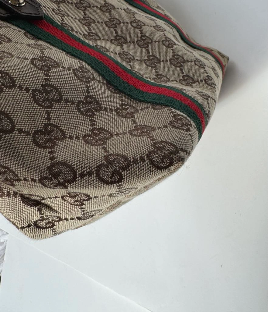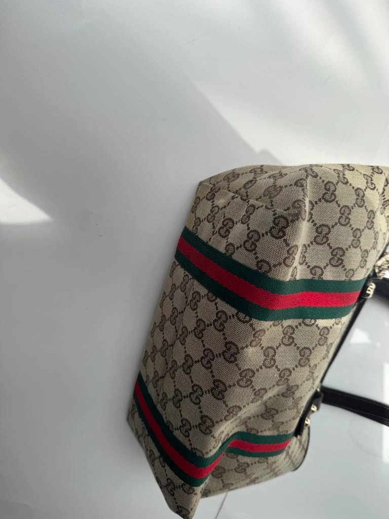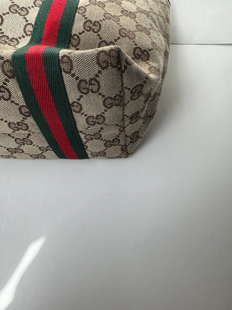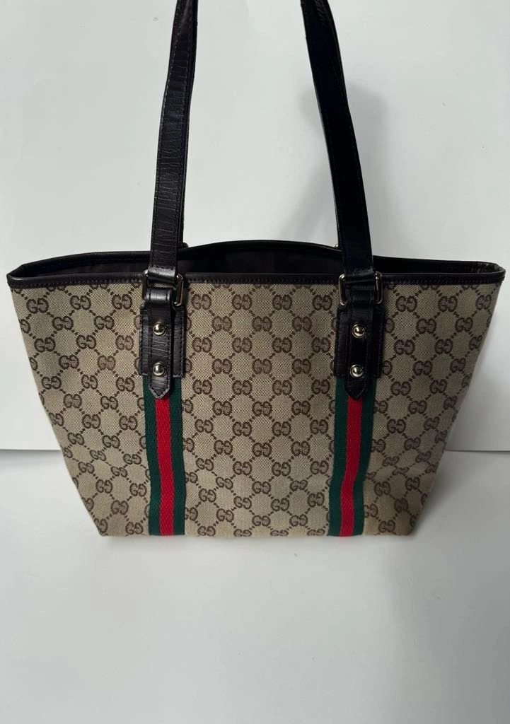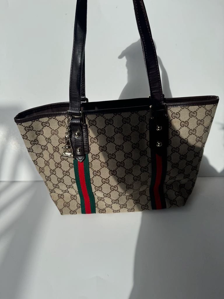 This is a classic Gucci GG Canvas tote bag with brown leather handles, green and red web stripe detail and a gold charm. It features a top zipper closure and an interior pocket. The bag is in good condition and comes with no dust bag.