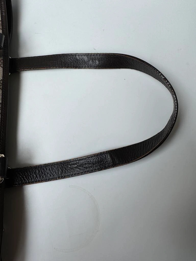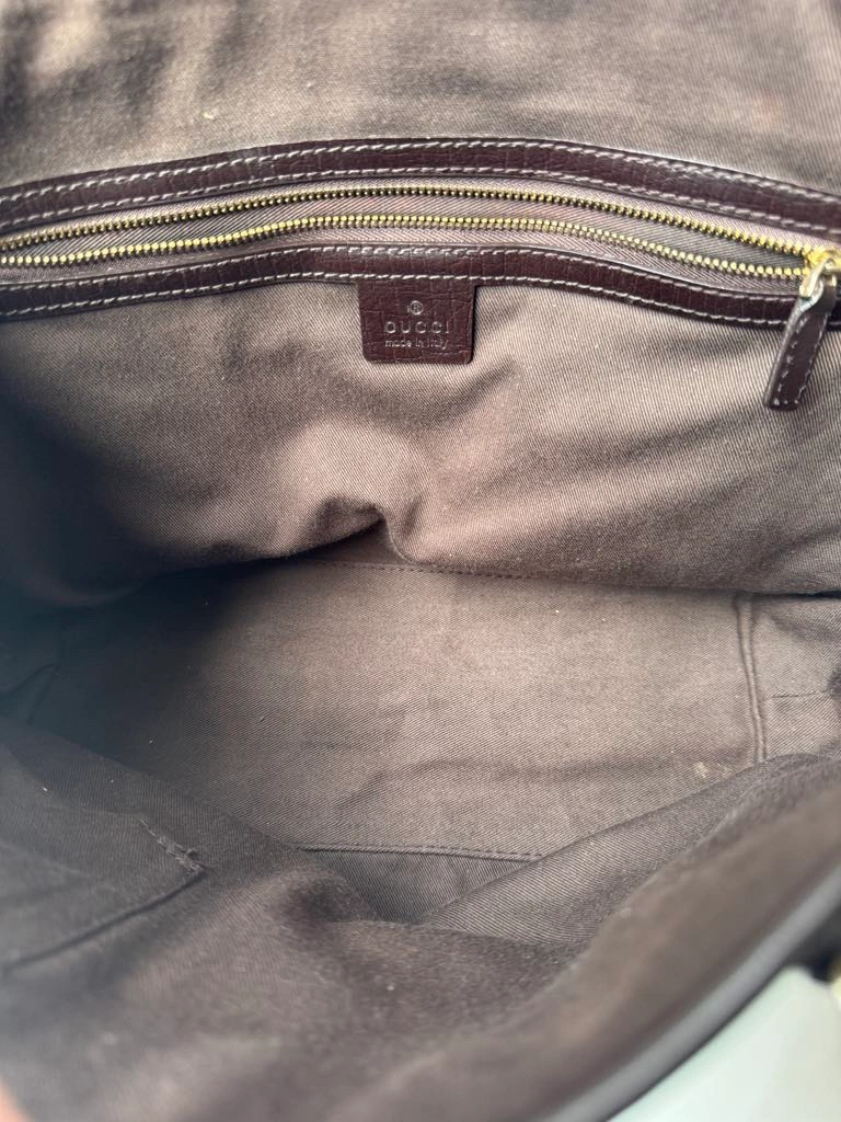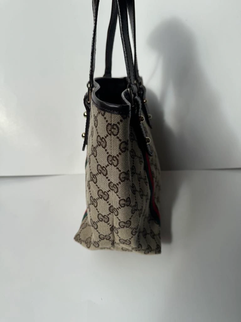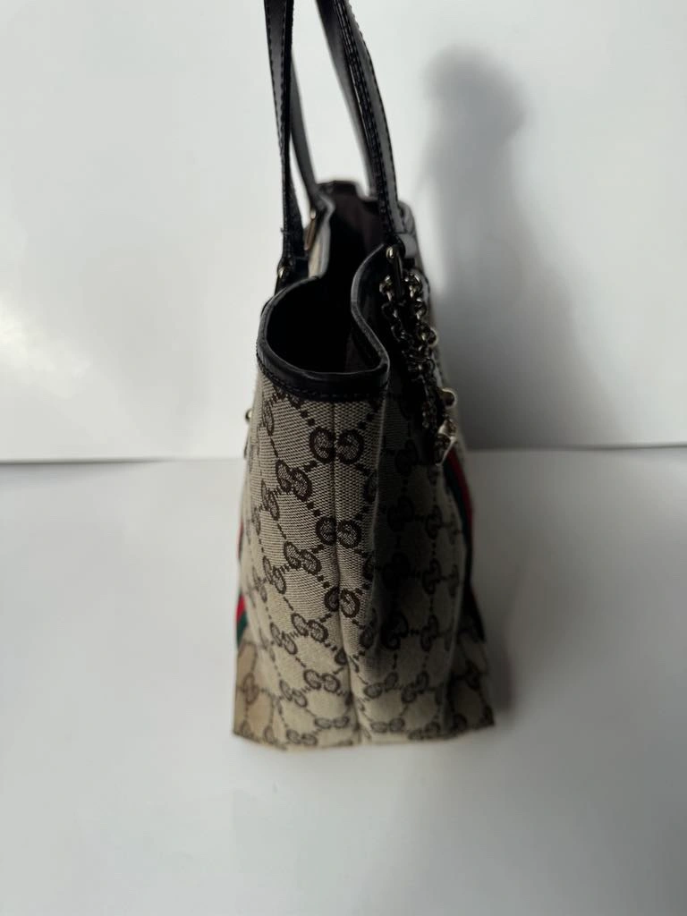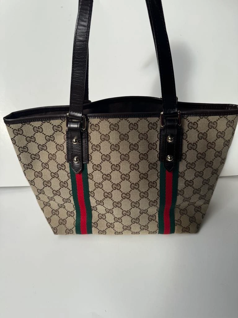 This is a classic Gucci GG Canvas tote bag with brown leather handles, green and red web stripe detail and a gold charm. It features a top zipper closure and an interior pocket. The bag is in good condition and comes with no dust bag.