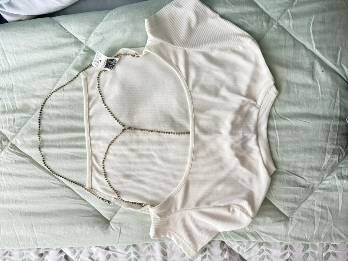 This is a white crop top with a cut out back. It features short sleeves, a round neckline, and a fitted silhouette. It has a chain detail on the back that goes all the way down to the waist.